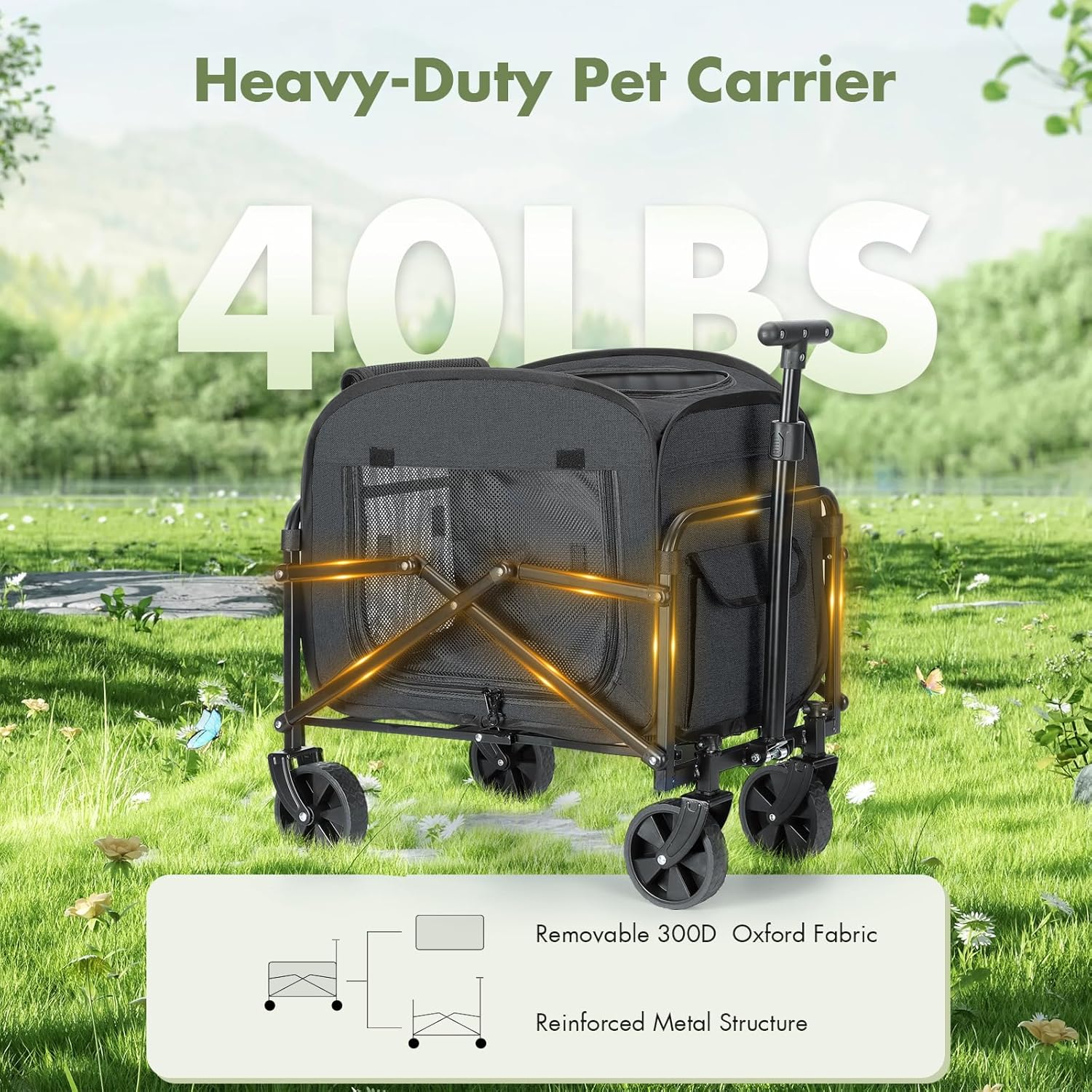 About this item 【Large Capacity】The dog carrier with wheels unfolded size: 54x39x42cm (without wheels); The roomy size offers enough room for your pup to sit or lie down comfortably. Suitable for two small dogs or cats up to 40lbs (18kg). 【Reliable Frames】This wheeled pet carrier is firmly structured with heavy-duty steel frames and durable 600D Oxford fabric that is tear-resistant and water-repellent. Comes with a solid padding for added support and comfort for your pet. 【Comfortable and Safe】The cat carrier with wheels has breathable mesh panels all around to offer excellent airflow, and the lockable zippers and inner safety strap designs keep your pets from jumping out. 【Easy to Maneuver & Versatile】90° adjustable handle and sturdy wheels allow for smooth movement on most terrains such as gravel, beach and grass. The pet carrier with wheels is great for taking your pet to the vet, camping, long walks and other outdoor activities. 【Easy Assembly & Foldable】The carrier is foldable design, storage is very convenient and saving space. If you need to take it on a trip, in the trunk of the car is also very suitable. › See more product details