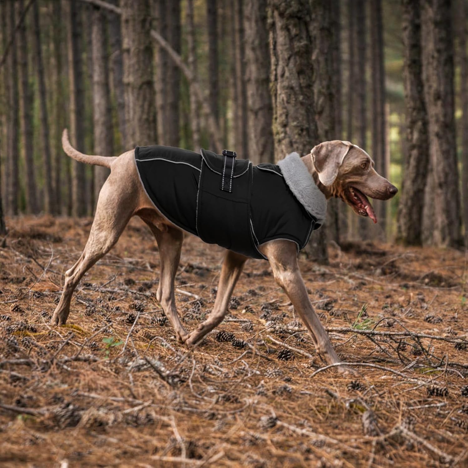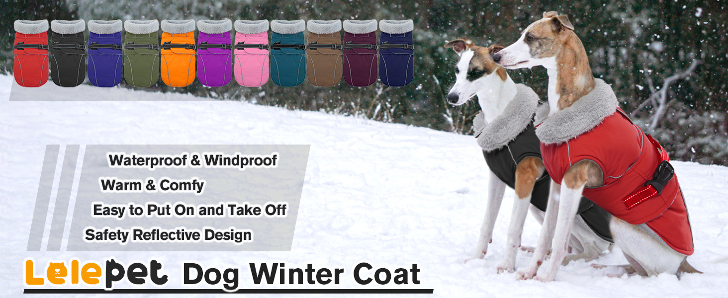About this item HIGH-QUALITY FABRIC: This large dog winter coat is made of premium polyester fabric that is windproof and waterproof. The interior of the waterproof dog coat is lined with fleece and has a fur collar to keep the dog warm even in freezing weather PADDED DOG JACKET WITH STRAP: This pullover large dog coat features an adjustable magic sticker fastener with a safety buckle, making it easy to put on and take off. Easy to wrap around and remove, providing a snug yet comfortable fit.Machine washable REFLECTIVE DOG VEST WITH LEASH HOLE: This dog snow jacket is designed with reflective strips, ensuring their safety during nighttime walks.It helps you locate your dog in low-light conditions. The back leash hole makes outdoor walking more convenient WATERPROOF DOG JACKET FOR COLD DAYS: Whether you are camping, snow skiing, or hiking, this dog fleece provides optimal warmth and dryness in foggy, lightly rainy, and snowy conditions. Lelepet warm dog winter coat is perfect for outdoor activities S, M, L, XL, XXL, XXXL DOG COAT WINTER: Comes in six sizes and seven colors. This fleece dog coat is suitable for small, medium, and large dogs. We recommend referring to the Lelepet size chart rather than relying solely on past experience › See more product details