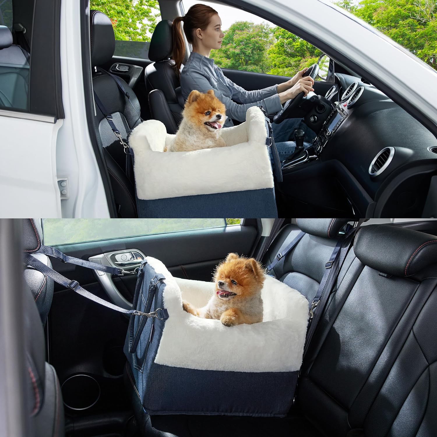 About this item Elevated Comfort & Views: Our premium pet car seat bed features a 6.5-inch egg crate foam base, raising your pet to window level, letting them enjoy the scenery and reducing travel anxiety. Perfect for curious pups who love a good view! Safety First with Front Bumper Pad: Keep your pet secure with the front elevated bumper pad, providing extra cushioning during sudden stops or quick turns. This innovative design prevents falls, ensuring your furry friend's safety and comfort throughout the journey. Secure and Stable Ride: Equipped with a four-point fixation system, this pet car seat bed stays firmly in place, no matter how bumpy the ride. The non-slip bottom adds extra grip, ensuring your pet's space remains steady and secure. Cozy Home Feel on the Go: Wrapped in ultra-soft, plush faux rabbit fur, the car seat bed mimics the comfort of home, calming your pet's nerves. The supportive pillows on each side provide a cozy spot to lean on, enhancing comfort during car rides. The superior materials used ensure your pet enjoys the ultimate in travel luxury. Easy to Install & Clean: Enjoy hassle-free setup with our three-step installation process. The double-sided cushion, featuring plush fabric for cooler weather and durable denim for all seasons, is removable and machine washable. The waterproof liner protects against spills and accidents, making maintenance a breeze. Plus, the added storage pocket is perfect for stowing toys or treats, keeping everything within reach. › See more product details