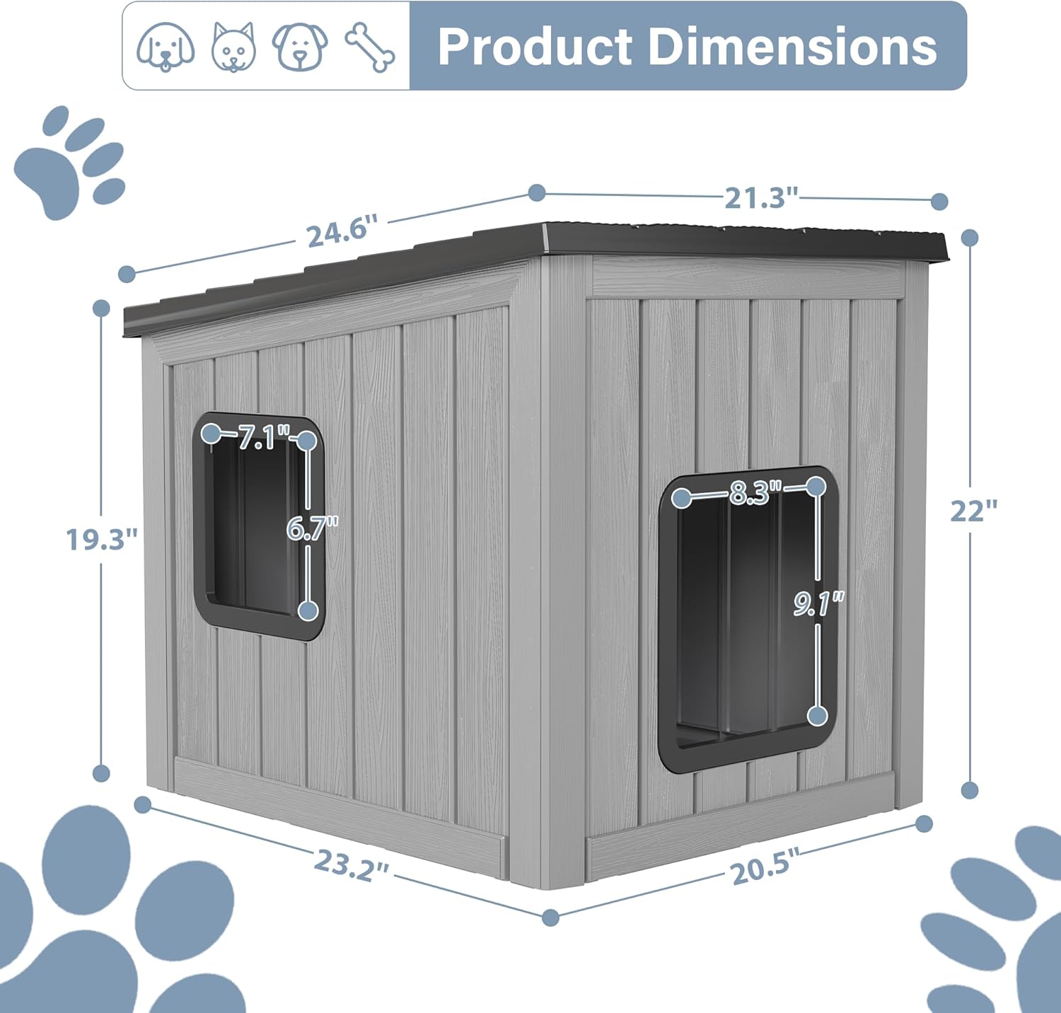 About this item Weather resistant resin structure: High quality resin materials have strong weather resistance and excellent insulation properties, sun protection and waterproofing, high strength and impact resistance, suitable for indoor and outdoor use. Natural materials will be more beneficial to the health of pets. Ventilation Design & Emergency Escape Hatch: The cat house features ventilation openings specifically designed for outdoor cats, promoting steady airflow for improved circulation. These openings also serve as emergency escape routes, allowing your furry friends to safely enjoy fresh air. Effortless Cleaning & Quick Assembly: The flip-top design simplifies cleaning, eliminating tedious maintenance. Superfast assembly requires no tools and takes just minutes to complete. For any questions, feel free to contact us anytime. Widely Applicable: This outdoor cat house size (23.2"D x 20.5"W x 22"H) is suitable for small pets such as puppies, cats, rabbits, chicks, or guinea pigs. This outdoor cat house weatherproof for cats feature a modern style design that will seamlessly blend into your home. Quick Assembly and Easy Cleaning: Installation can be completed in minutes without the need for any tools. High quality resin materials are easy to clean, eliminating the trouble of cleaning. If you have any questions, please feel free to contact us at any time. › See more product details