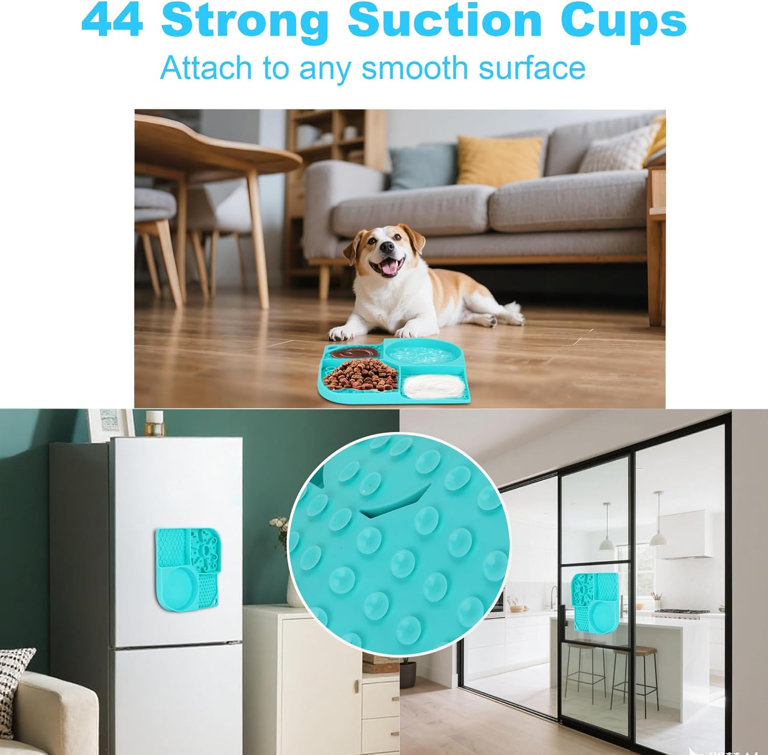 About this item 【Muti 4-ZONE FEEDING Mat】 Our innovative design combines a slow-feeding bowl, water reservoir, and dual-texture lick zones (honeycomb + cylinder nubs) in one 8.26" mat. Perfect for meals, snacks and mental stimulation, with convenient hanging holes for storage. Includes silicone spatula 【HEALTHY EATING HABITS & COMFORTABLE DIGESTION】 The maze-like slow-feed compartment reduces eating speed, while textured lick pads naturally clean teeth. Ideal for preventing bloating in fast-eating dogs. 【EXTRA-STRONG 44-SUCTION CUP BASE】 Made with premium food-grade silicone suction cups provide stability on tiles, floors or bathtubs. - even for energetic large breeds. (Supervision recommended for power chewers) 【EASY-CLEAN & SAFE MATERIAL】 Food-Grade silicone is top-rack dishwasher safe (no heated dry)- food wipes off effortlessly, freezer and microwave compatible 【CALMING LICKING ACTIVITY FOR STRESS RELIEF】 Licking naturally soothes dogs during stressful moments like baths, vet visits or thunderstorms. The textured surfaces provide mental stimulation to keep pups engaged. Perfect for anxious dogs or high-energy breeds needing focus › See more product details