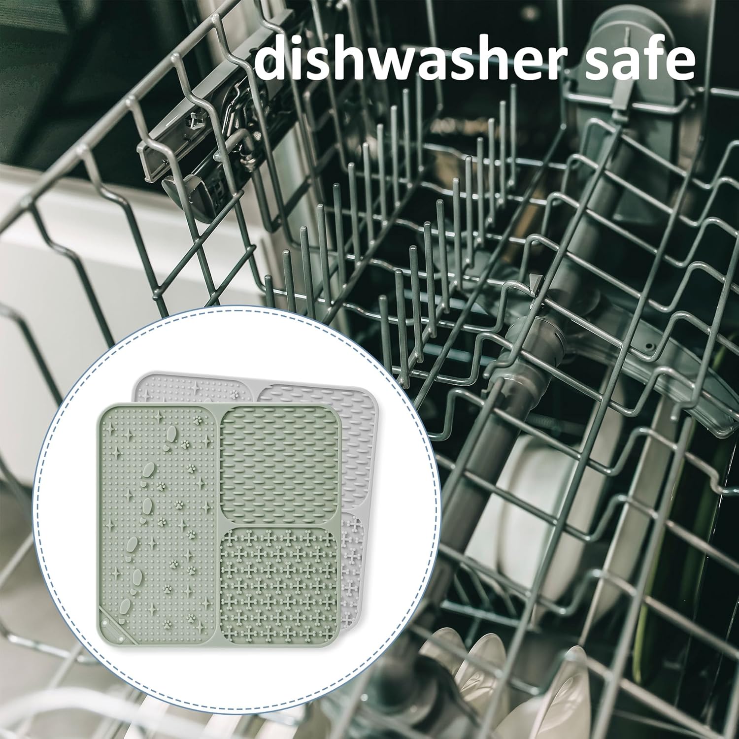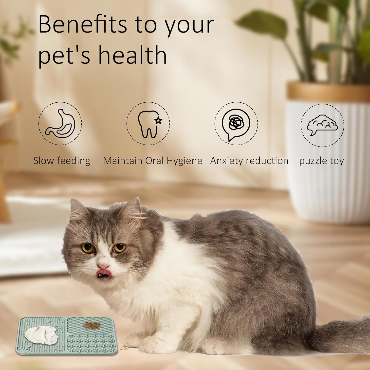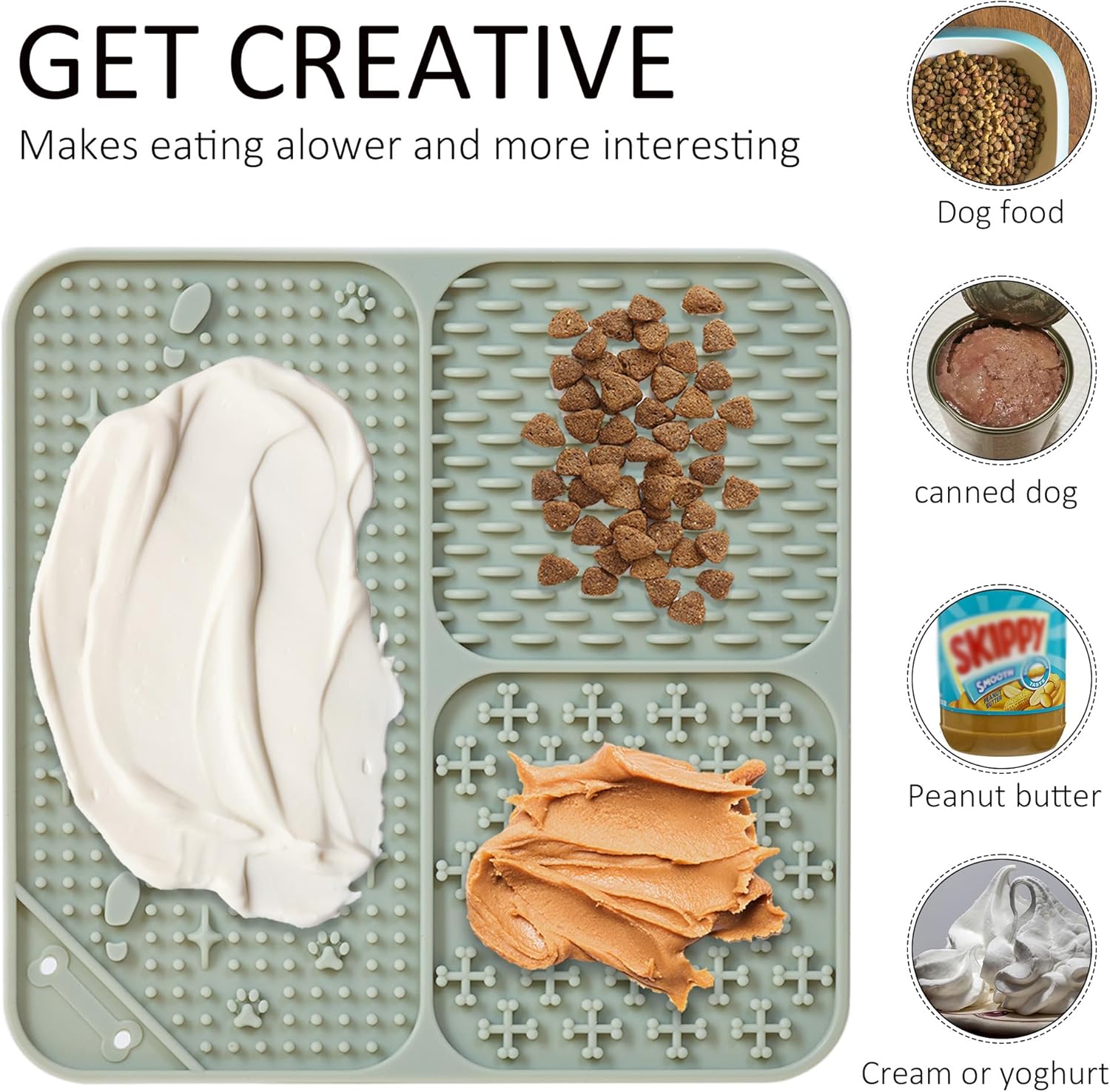 FOOD GRADE licky mats for dogs: This slow dog feeder mat is a unique slow-feeding dog bowl that is suitable for all breeds of sizes of dogs and mat, the different indentation design helps pets develop good eating habits, improves healthy digestive system and avoids swelling and choking. As puppy bowls for small dogs and interactive dog toys, our food mat for cats is perfect for stressful moments such as dog training, grooming, bathing, nail trimming, and injury recovery. Multi-purpose lick pad: This small silicone mat package includes 2 sets of silicone cat feeding mats. Suitable for spreading cheese, yogurt, peanut butter for dogs, pumpkin puree, and more. Clear demarcation line, no food clutter, keep eating area clean. EASY TO CLEAN AND STORAGE: This licking mat for large dogs is made of silicone material, heat resistant and safe for microwave use, also safe for freezer storage in the refrigerator, and all-round protection for your beloved pet's health. Rinse with clean water and fold or hang for storage.