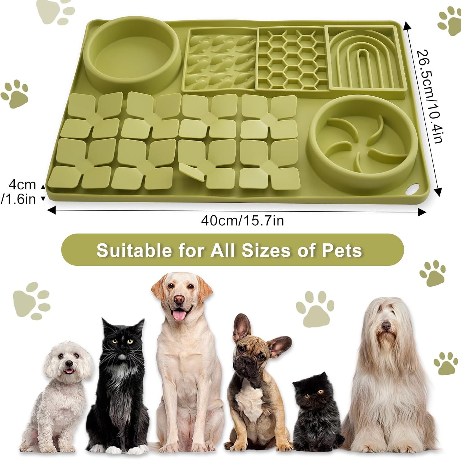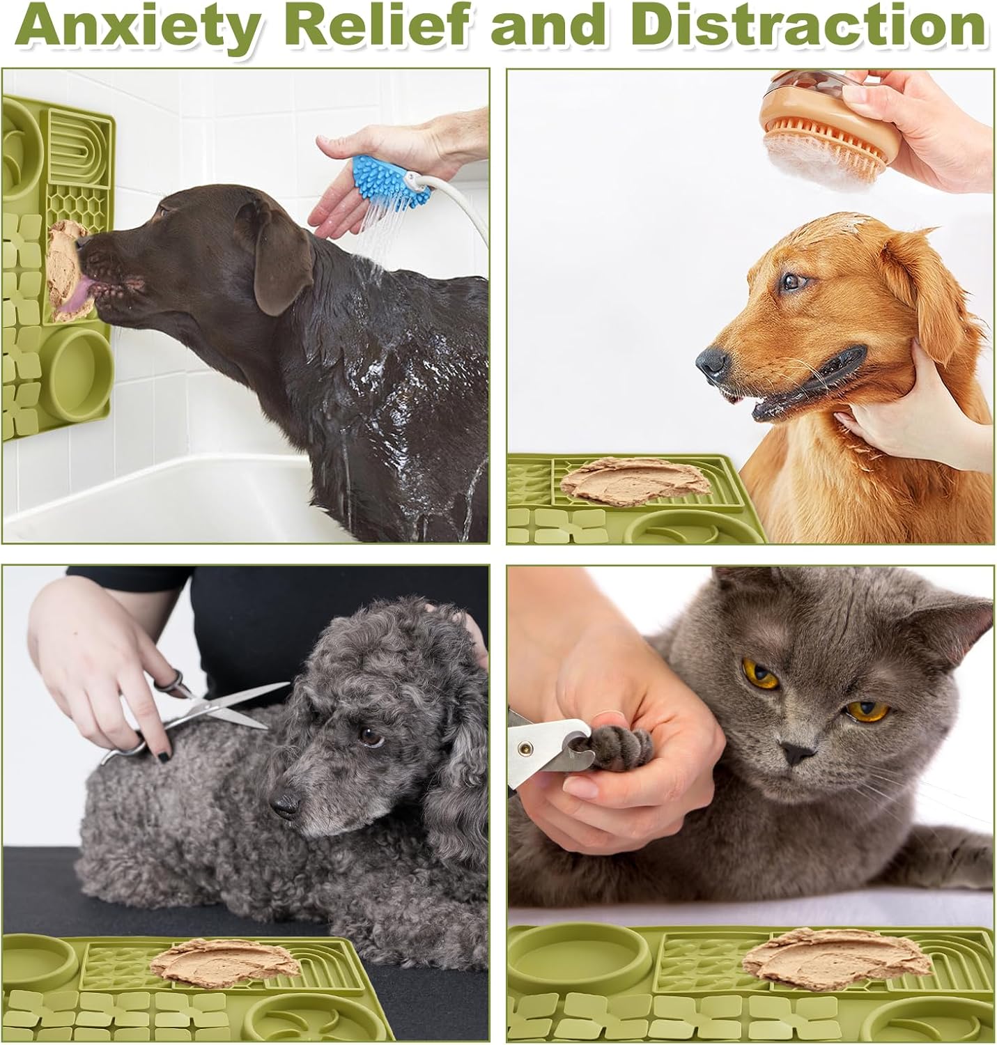 Still worried about your dog eating too fast and getting anxious easily? Try our dog lick mat designed for pets and give your furry child a whole new eating and entertaining experience! Rich Packaging The package contains not only a dog licking mat, but also a squeegee as well as a small brush. 6-in-1 licking area design This lick pad is cleverly designed with a variety of licking areas with different textures, including leaf-shaped protrusions, honeycomb structure and curved grooves, etc. The design of this lick bowl is like a little paradise full of surprises. As your dog licks, he or she can explore the amazing textures, adding to the fun of eating. 1 water bowl: convenient for pets to drink water. 2 slow food area: Place solid food, such as dog wolf, beef jerky, snacks, etc. 3 licking areas with different textures: place liquid food, such as yogurt, peanut butter, etc. Helps with slow eating The special design makes the dog have to slow down the speed of eating, effectively avoiding the burden on the stomach caused by wolfing down the food. By eating slowly, food can be more fully digested and absorbed, making the dog's stomach healthier and allowing the pet to develop good habits. Soothes Anxiety Licking is a self-soothing behavior for dogs and our licking pads take full advantage of this. It's the ideal solution for keeping your dog entertained and relaxed, especially when they're bored or anxious. Whether you're bathing your dog, leaving them home alone or crate training, this licking pad will keep them focused and calm. Non-slip design Designed with suction cups on the bottom of the puppy lick mat , it can be firmly attached to any smooth surface, preventing the lick mat from sliding when your dog is eating. High Quality Material. The slow feeder bowl is made of food-grade silicone to ensure safe licking for your dog. The soft and flexible material will not harm your dog's mouth, and at the same time, it is sturdy and durable enough to withstand repeated licking and gnawing by your dog, and can be used repeatedly. Easy to clean The smooth surface of the dog licky mats is not easy to leave food residue, and it is easy to clean. It can be rinsed with water or washed in the dishwasher, saving you time and energy. Let the lick mat become a good partner in your dog's life, bringing them health, happiness and relaxation!