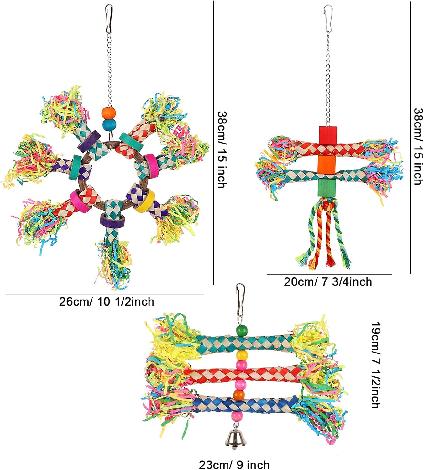 About this item VARIED DESIGN: The set Includes 5pcs different types of colorful bird Shredding toys, birds can play, chew, and explore freely, ideal size for small and medium birds, such as parakeets, conures, cockatiels, lovebirds, etc KEEP ACTIVE: Chewing and shredding are behaviors of birds that are associated with foraging and nesting, which can make birds have hours of fun every day as well as help promote their physical health SAFE MATERIAL: Our bird foraging toys are made of wood, and edible crinkly papers, non-toxic, and safe for all types of birds to peck, chew, and play. Your pet can enjoy them without any worries BEST BIRD TOYS: These bird-shredded toys are stuffed with bright colorful crinkly paper, which will easily catch birds' eyes and attract birds to play and keep busy for a long period EASY TO INSTALL: All the bird toys come with an active hook to connect the steel hook to the top of your pet cage for easy installation. It can be easily installed in or out of almost any cage › See more product details