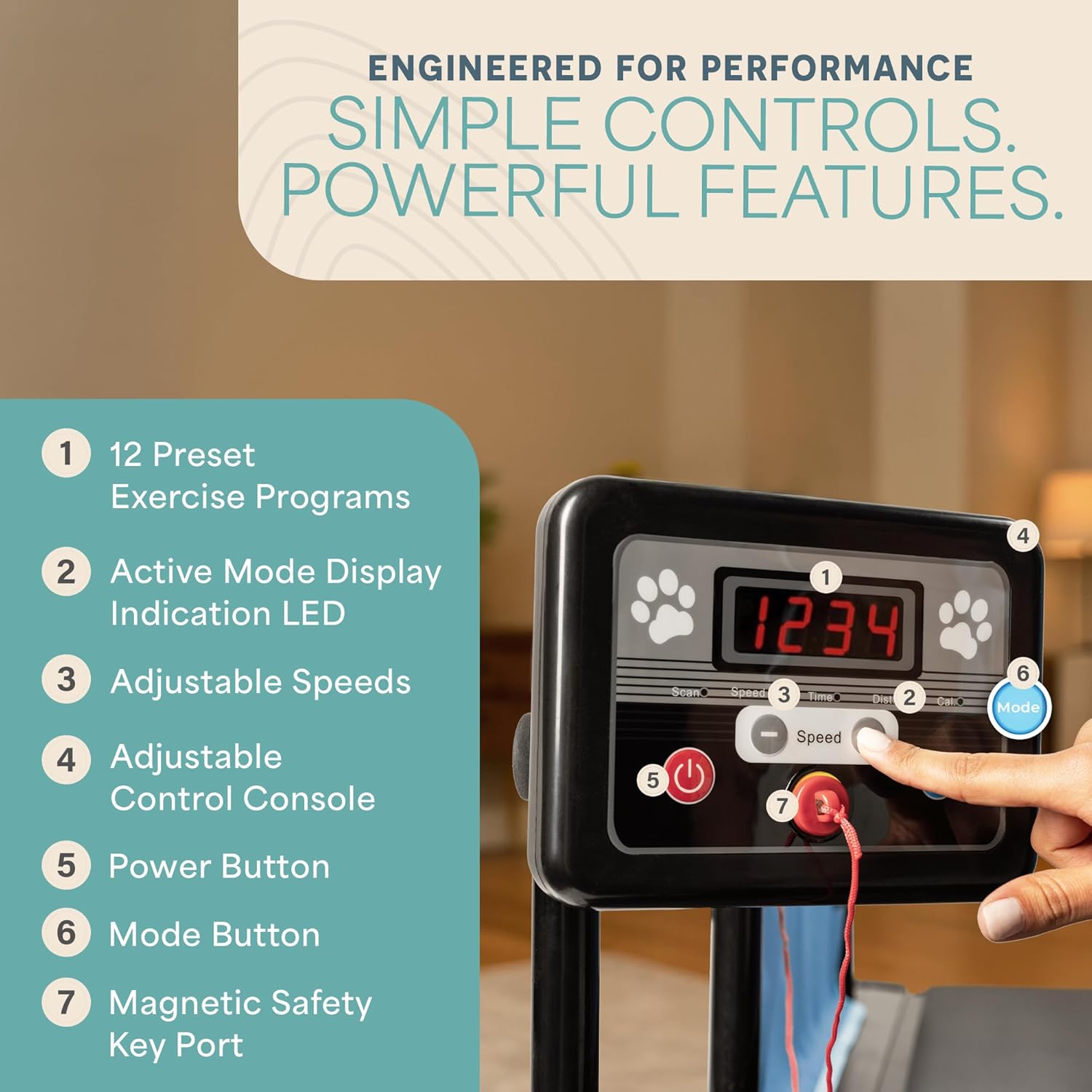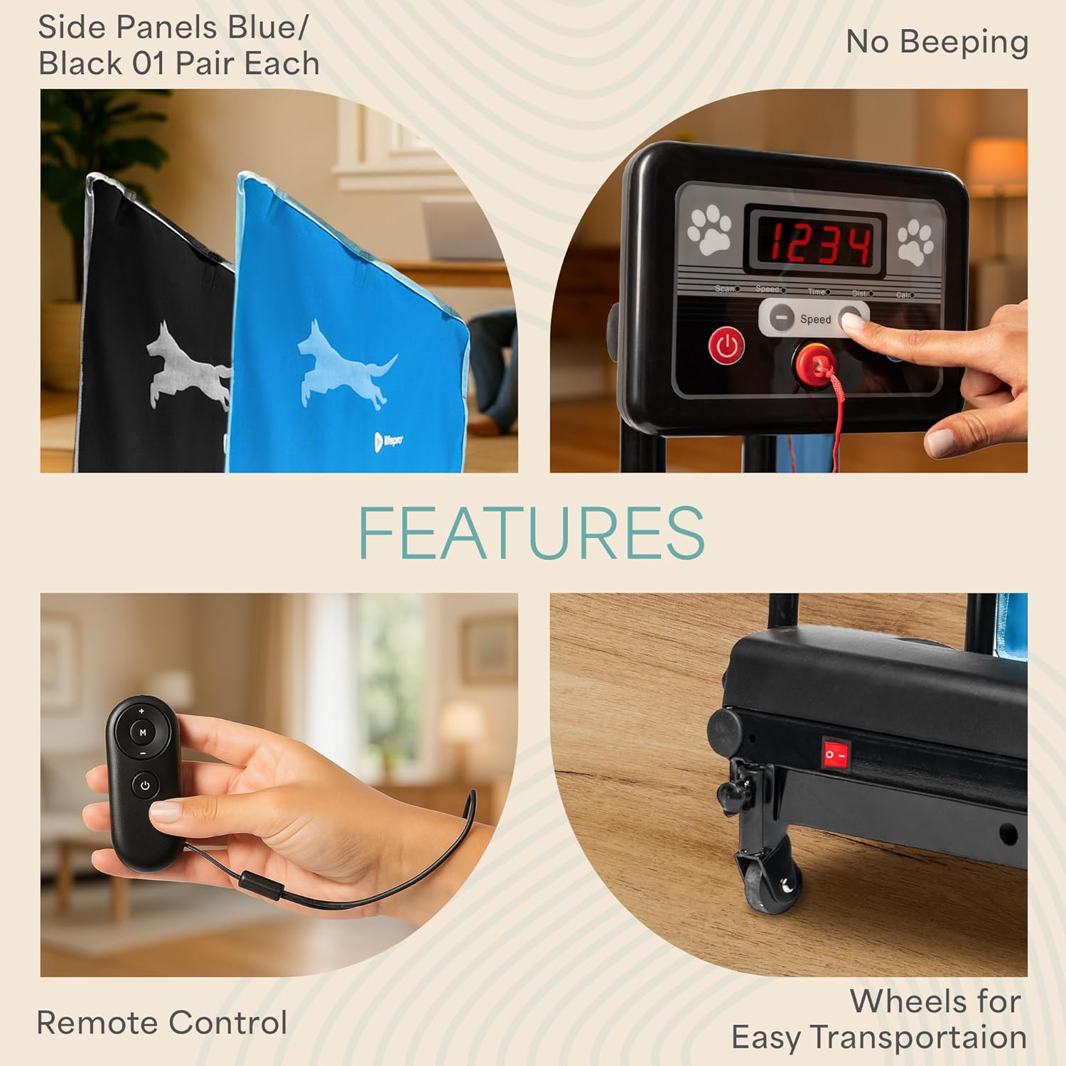 About this item IMPROVE YOUR DOG'S HEALTH: PawRunner doggy treadmill improves your pet's blood circulation and blood pressure. Our dog running machine helps dog lose weight. Taking care of your dog's health has never been easier without our pet treadmill for dogs. EFFECTIVE EVERYDAY EXERCISING: Remote control adjusts speed of dog exercise wheel - Even you are busy, your pet will not miss exercise. Whether it's too hot, too cold, or bad outside, support your pet's exercise routine with our dog exercise machine. POSITIVE EXPERIENCE: Dogs are extremely sensitive to sounds & vibrations. That's why special designed ultra-quiet motor in our dog treadmills is for in-home use so your dog has comfy experience. Let your pet enjoy our small dog trotter treadmill. SAFETY FIRST: PawRunner puppy treadmill is carefully designed to protect your dog. It features a safety key & an emergency stop button which helps your dog enjoy exercise safely. It is not a dog treadmill for large dogs but small & medium dogs only. SIMPLICITY & PEACE OF MIND: In just 10 minutes you can easily install the canine treadmill for small dogs. Sit back & relax or get your extra work done knowing you've taken good care of your dog's health with our dog treadmill for medium dogs. › See more product details