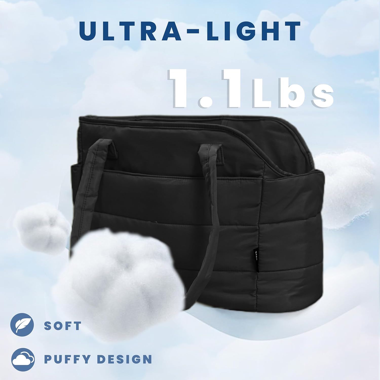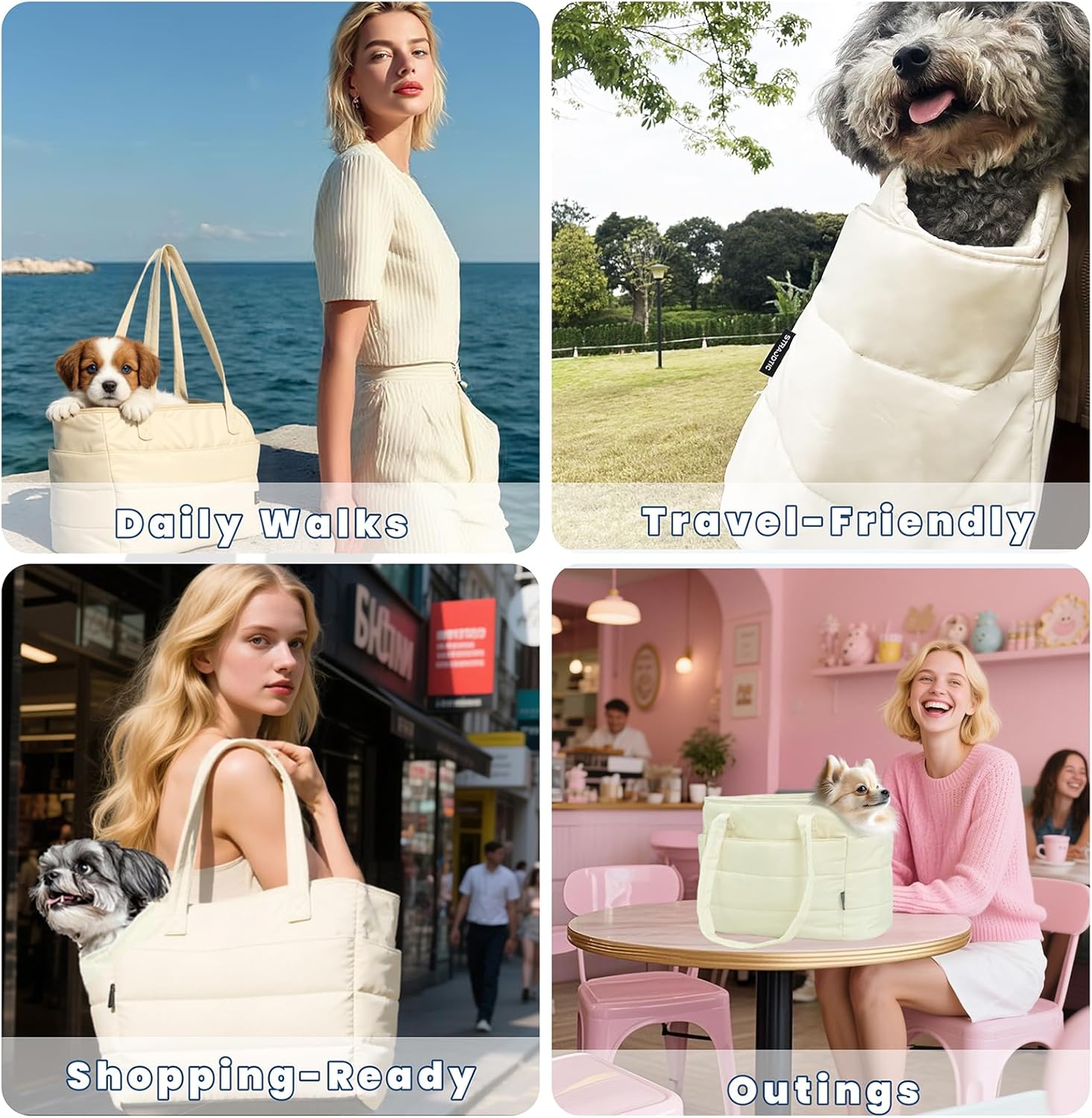 About this item Ultra-Light & Stylish Puffy Design: Weighing just 1.1 lbs, this chic puffy dog carrier is crafted from ultra-light materials with a fashionable quilted exterior. The removable padded hard-bottom base provides strong, stable support. Perfectly sized at 17"L x 8"W x 12"H to comfortably carry small dogs up to 15 lbs (6.8 kg)—ideal for Chihuahuas, Yorkies, puppies, and other toy breeds. Soft Interior & Easy-Clean Exterior: Your pup rides in luxury! Lined with super-soft, premium plush fleece for ultimate comfort. The durable water-resistant puffer fabric exterior sheds light spills and wipes clean easily – perfect for everyday adventures. (Base pad is removable for cleaning). Built-In Safety Leash Clip: Securely fasten your pet’s collar or dog harness to the sturdy metal clip inside this dog carrier purse—preventing escapes, jumps, or falls. This anti-escape safety tether gives peace of mind during travel, crowded outings, or sudden movements. Storage Pockets for Dog Essentials: Stay organized with easy-access front and side pockets! Holds dog treats, leashes, poop bags, dog water cup, keys, phone, and more. A must-have dog walking accessory for hands-free pet travel. Fashionable Dog Purse for Women on the Go: Stylish and functional, this pet carrier purse is perfect for shopping, cafes, travel or walks. Combines pet carrier design with portable convenience that keeps your furry companion close—great for urban adventures or casual outings. › See more product details