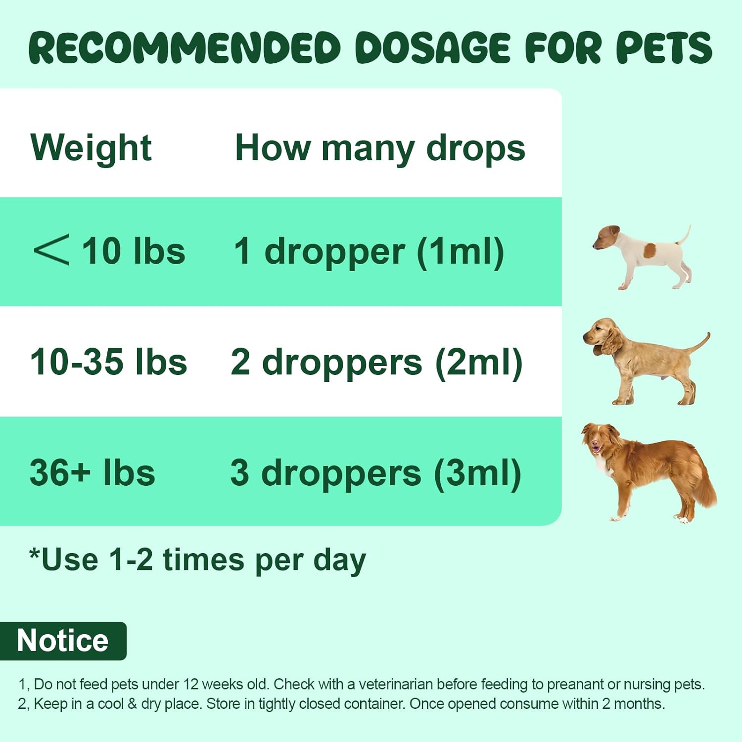 - Directions: For large dogs over 36 lbs use three full droppers daily on food or directly in mouth., For medium size dogs 10-35 lbs use two full droppers daily on food or directly in mouth., For small dogs less than 10 lbs use one full dropper daily on food or directly in mouth.