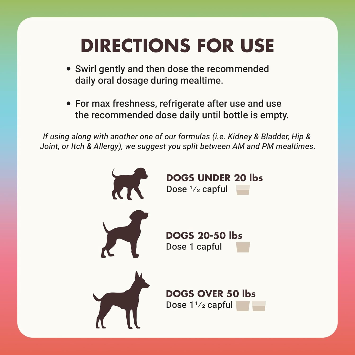 - Directions: 1.) Find your dog's recommended daily oral dose under 20 lbs. = 1/2 capful; 20 - 50 lbs. = 1 capful; over 50 lbs. = 1.5 capfuls. 2.) Shake thoroughly and then dose the recommended oral dosage during mealtime. 3.) For max freshness, refrigerate after use and use the recommended dose daily until bottle is empty.