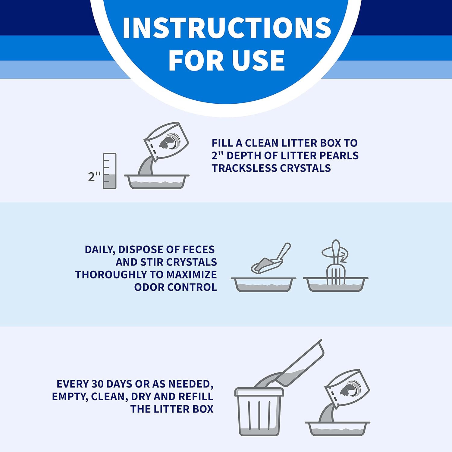 - Directions: Fill a clean litter box to 2 inch depth of Litter Pearls Tracksless. Daily, dispose of feces and stir crystals thoroughly to maximize odor control effectiveness. Every 30 days or as needed, empty, clean, dry and refill the litter box. Cat feces can transmit toxoplasmosis, which can be a health risk especially to pregnant women and the immunosuppressed. Always wash hands after handling used cat litter or the litter pan.