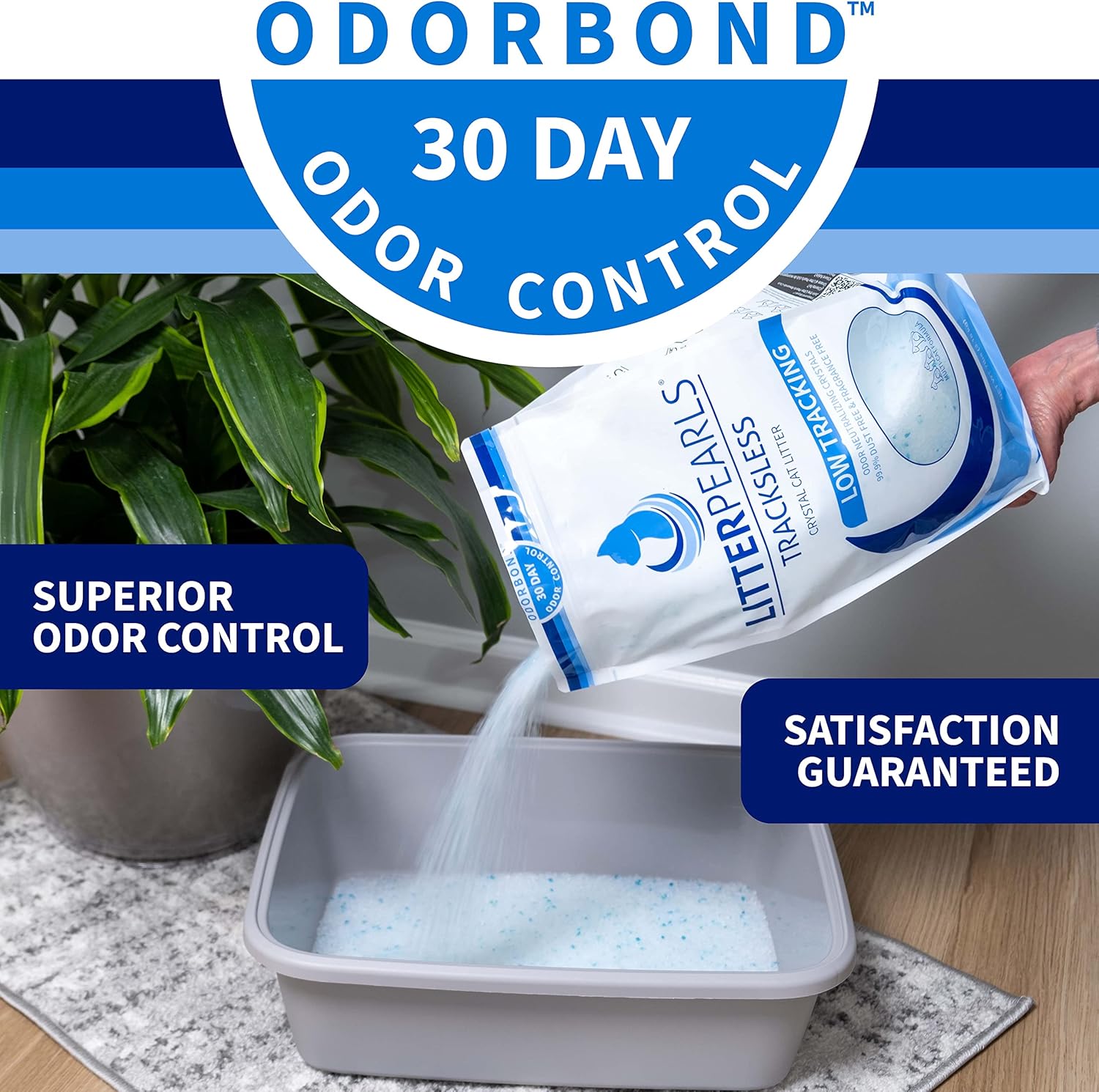 Litter Pearls Tracksless crystal cat litter with ODORBOND is the ultimate non-clumping litter for odor control. Litter Pearls was the first U.S. brand of crystal cat litter and is made with the highest quality Silica Gel crystals available. Silica Gel is safe, non-toxic and allergen-free. Not only are Litter Pearls crystals safe for cats and people, they are also lightweight with high absorbency properties, requiring less litter than clay and other types of litters. This means, using Litter Pearls, less litter per cat ends up in the landfill. Trackless crystals’ powerful odor control is supplied by ODORBOND Technology, a proprietary, safe additive which neutralizes ammonia odors on contact. When used as directed Litter Pearls Tracksless will control ammonia odors for up to 30 days, keeping the litter box fresher, longer. Litter Pearls Tracksless low-tracking crystals are fragrance free and comfortable on cats' paws for a more pleasant litter experience.