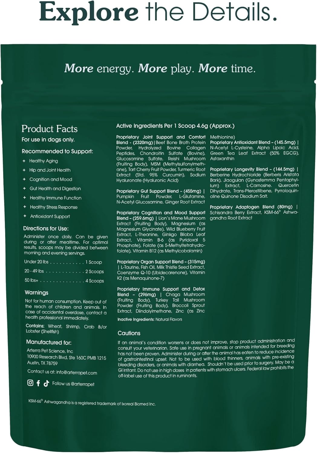 About this item Comprehensive Wellness and Longevity Support: Our all-in-one, preventative adult formula is designed to optimize your dog’s lifespan and delay the onset of degenerative aging. This daily supplement supports healthier joints and hips, mood, vitality, digestion, gut health, organ function, brain health, cellular support, skin and coat health, and overall wellness for optimal longevity. Premium, Natural Ingredients: Made with 46 powerful ingredients for maximum anti-aging benefits, Arterra’s formula is developed by veterinarians and backed by science to ensure the highest quality and efficacy. Our product delivers more comprehensive health support than others on the market, significantly outperforming competitors in both ingredient quality and dosage. Made in the U.S.A., 100% filler-free, and backed by our Results Guarantee, Arterra is the superior choice for your dog’s health needs. Advanced Hip & Joint Mobility Care: Promotes joint health, eases discomfort, and supports connective tissues. Loaded with 10 effective ingredients, including Glucosamine, Chondroitin, Bone Broth Protein, Collagen Peptides, and MSM, our formula aids in hip and joint lubrication and cartilage health, ensuring your dog maintains mobility and comfort. Optimal Digestive Health: Infused with prebiotics, botanicals, and gut-supporting amino acids, our supplement improves intestinal integrity, supports efficient digestion, and helps alleviate gastrointestinal issues for enhanced overall well-being. Cognitive Function Enhancement: Supports brain health and enhance mood stability with Fish Oil rich in Omega-3 EPA and DHA, Magnesium Glycinate, Lion’s Mane, and other functional nutrients that promote cognitive function, helping your adult dog stay sharp, alert, and mentally active as they age. Easy To Use: Arterra is simple to administer—just mix the appropriate scoop size with your dog's daily food based on their weight, making it an effortless and tasty addition to their wellness routine. See results in as little as one week to 30 days, as the benefits are cumulative and amplify over time. › See more product details