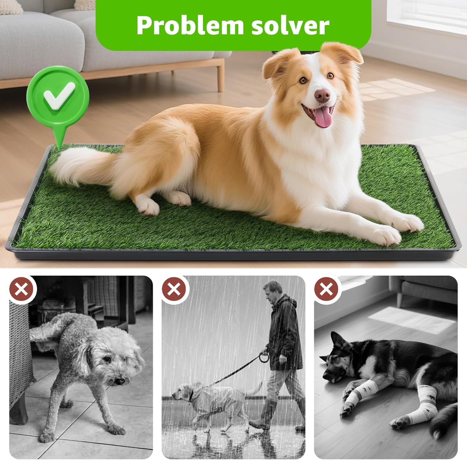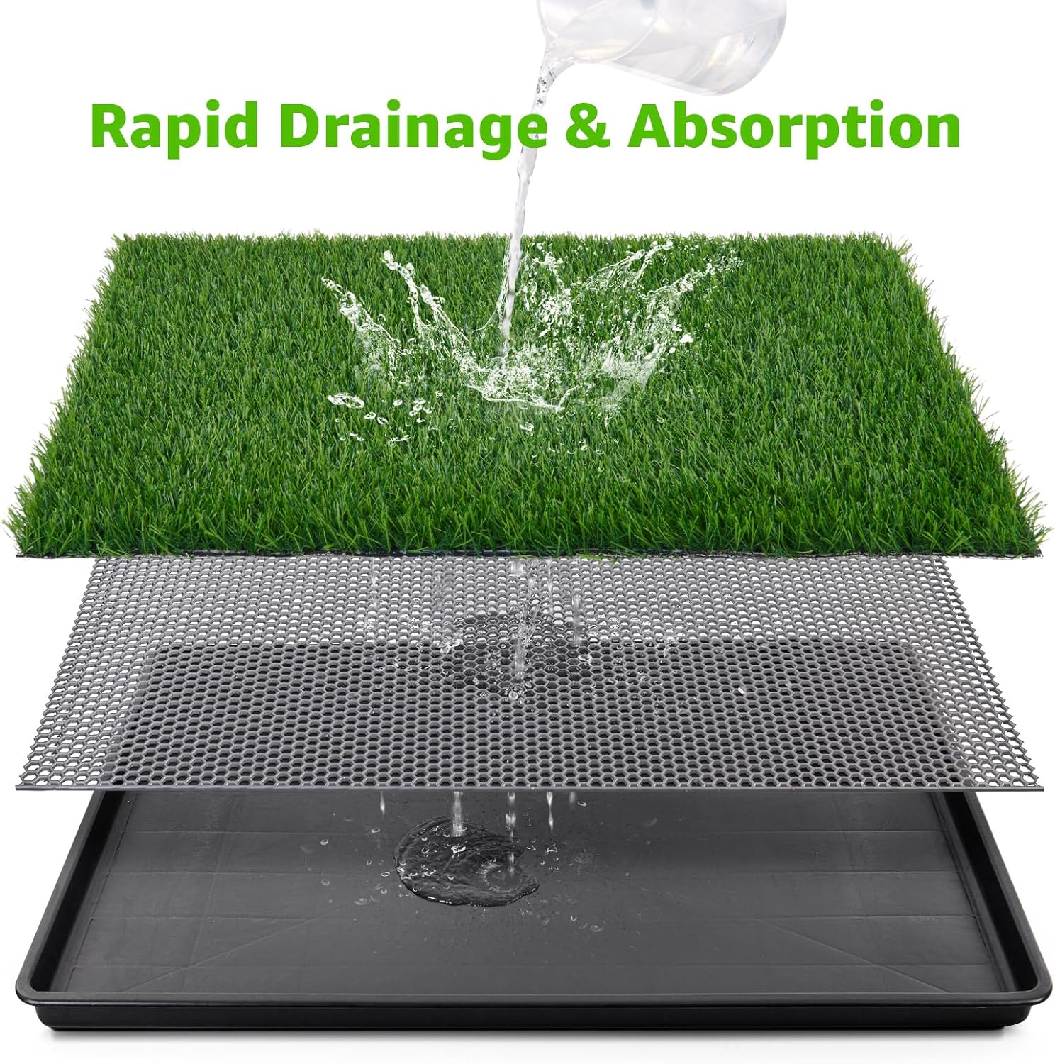 About this item 35"x23" Large Dog Potty Tray: The 4-layer design features artificial grass, drainage Grate, and a durable tray that efficiently collects and separates urine, making cleanup quick and hassle-free. Perfect for dog training, it ensures your pet's comfort while keeping your floors and carpets safe from messes. A must-have for a cleaner, stress-free home! Quickly Absorbency: Dog litter box with a specially designed backing allowing for complete drainage, you will have no need to worry about your dog running over your new rug in the living room with their muddy paws from potty training. Large artificial grass for dogs potty gets your dog used to the feel of real grass while potty training, to meet your pet's needs. Extra Large Pet Loo: The grass pads for dogs with a large tray size is 35x23 Inches make it ideal for medium or large dogs. The indoor dog potty is designed for your pet's ideal experience looks and feels just like real grass. Not only that, but your dog will love on their grass pad with a tray while business, keeping their paws clean and staying safe and healthy all the while. No-Fuss Clean & Easy To Maintain: This easy-to-clean potty patch for dogs can be restored to a like-new condition by simply rinsing it with mild detergent first, followed by fresh water. Pet pee pad with tray is extremely low maintenance. So you're not spending hours cleaning up your turf grass pad or constantly worrying about your beloved furry friend's safety. All Places Use: Perfect for smaller spaces such as RV's, campers, apartments, sunrooms, and balconies. This dog pee grass pad tray is designed to accommodate the potty training needs of puppies, puppy grass pads with trays are also excellent for senior dogs that cannot get around as well as they used to or dogs who are sick or disabled. › See more product details