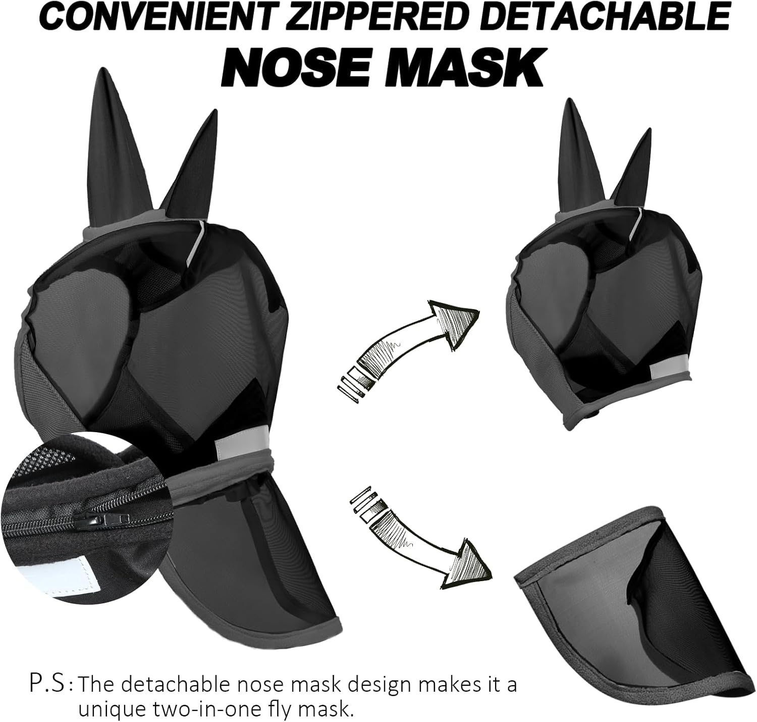 About this item 【High-Spec UV & All-Scenario Pest Defense】 Our lab-certified horse fly mask, an anti-fly mesh horse mask with UV protection, blocks 60%-90% of UV rays. This fly mask for horses shields light-skinned or blue-eyed horses from sunburn and infections. The dense micro-mesh of our fly mask covers face, eyes, ears, and nose, fending off horseflies, ticks, and pollen. Suitable for grazing to riding, our fly masks for horses with ears—including pony and mini horse options—ensure all-scenario protection. 【Detachable Nose Flap & Practical Hook-and-Loop Webbing Design】 The detachable nose flap on our fly mask with nose cover adjusts via hook-and-loop for seasonal needs, ideal for shared use among horses and donkeys. Elastic hook-and-loop straps secure our professional choice fly mask in single L size, fitting standard horses. Available in styles like fly masks for horses with ears, it prevents slippage during any activity, balancing functionality and convenience. 【Nighttime Reflective Strips & Ergonomic Protection Structure】 Fly masks for horses with ears and nose feature forehead/nose reflective strips for nighttime visibility. Double-Dart Stitching keeps our horse fly mask away from eyes, while 13-inch ear covers and a three-hole cap balance protection and vision. Whether a yearling fly mask or draft horse fly mask, our equine fly masks prioritize safety through ergonomic design. 【Skin-Friendly Materials & Pressure-Relieving Comfort Details】 Our horse fly mask uses coated nylon micromesh on the face and airflow fabric on ears for cooling. Fleece padding reduces friction, preventing pressure marks. A forelock opening and split-top design make our fly mask for horses—including foal and mini donkey styles—comfortable for long wear. The shires fly mask and others offer skin-friendly durability. 【Single L-Size Adaptability & Long-Lasting Durability Design】 The L size of our fly masks for horses fits standard adult heads (15-17 hands), simplifying sizing. Wear-resistant nylon and dual hook-and-loop fastenings make our horse fly control masks tough against nibbling. Lab-tested 2pcs mosquito mesh ii sun visor fly masks maintain protection after washing, while options like horse fly mask with ears ensure lasting defense. › See more product details
