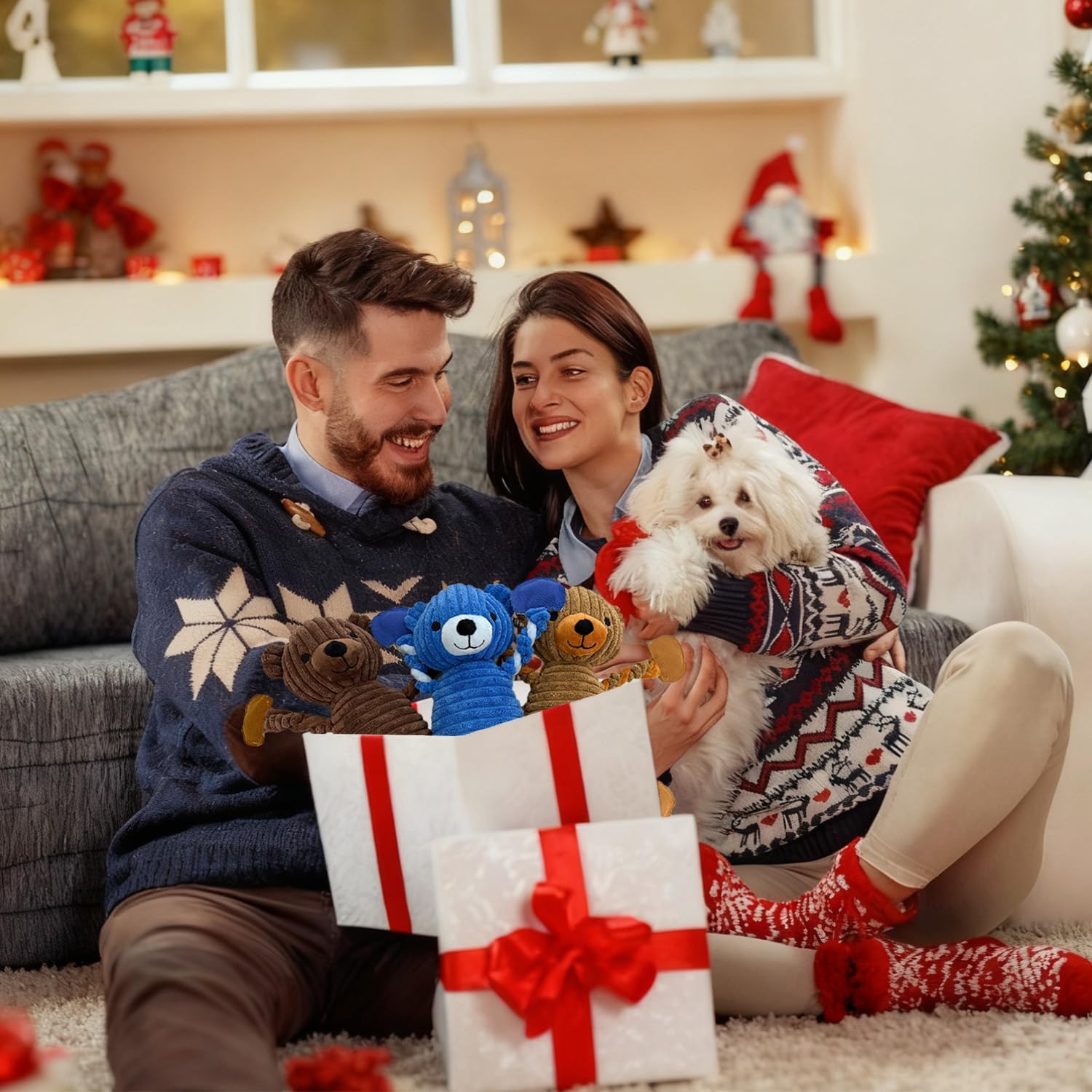 【Soft Plush Dog Toys】This plush dog toys are made of soft and durable Beibei velvet and Super-softvelvet with thick fabric and strong stitching, which is comfortable for dogs to chew and won't hurt their gums and mouth. Machine washable and very easy to care for daily. 【Funny Squeaky Dog Toy】This draw and pull bear dog toy built-in with 5 durable squeakers,which can emits squeak sound when squeezed or chewed,which can effectively attract your dog's attention and stimulate their desire to play. 【Tug of War Dog Toy 】 This cute stuffed animal dog toy is perfect for small medium and large dogs tug of war, pull, drag, toss and fetch games to increase interactivity. This interactive dog toy is not only fun but also a great stress reliever for your pets, helping to reduce boredom, release mood and prevent damage to furniture. 【puppy teething toys】Crafted from non-toxic, safe materials, crinkle textured fabric on the surface, comfortable to touch, can effectively clean dog's mouth and won't harm dog's gums, can promote dental health, increase exercise and maintain weight and health. Ideal for puppies, small to medium-sized dogs. 【Christmas Gift for Dogs】This dog toy is a perfect Christmas gift for your pet. The cute and funny bear image element design makes it a delightful surprise for your dog. Whether it's for Christmas, Thanksgiving or celebrating a birthday, this dog toy is an excellent gift choice. › See more product details