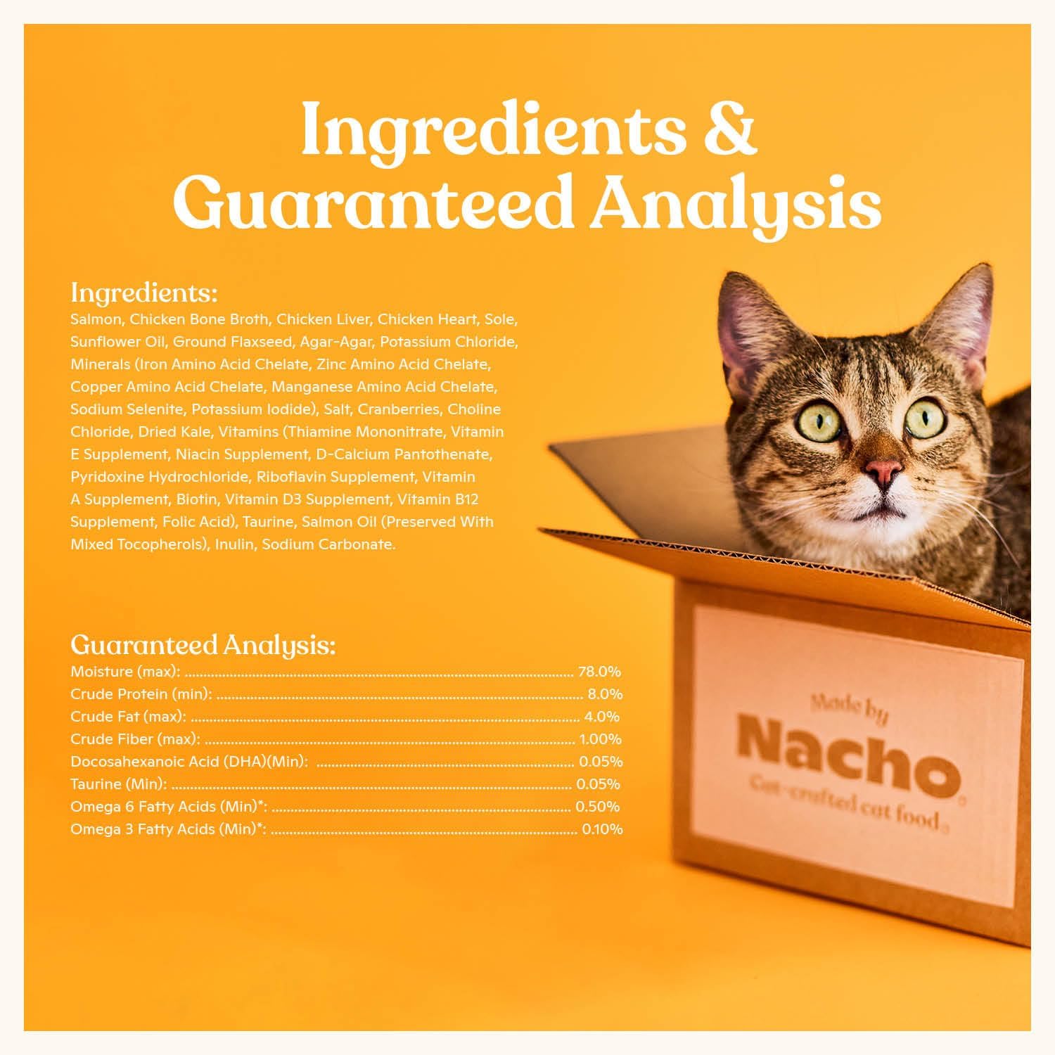 We combined sustainably caught salmon with sole for a silky-smooth grain-free pâté that’s as nutritious as delicious. Hydrating bone broth (Nacho’s signature ingredient) adds concentrated protein and a burst of flavor