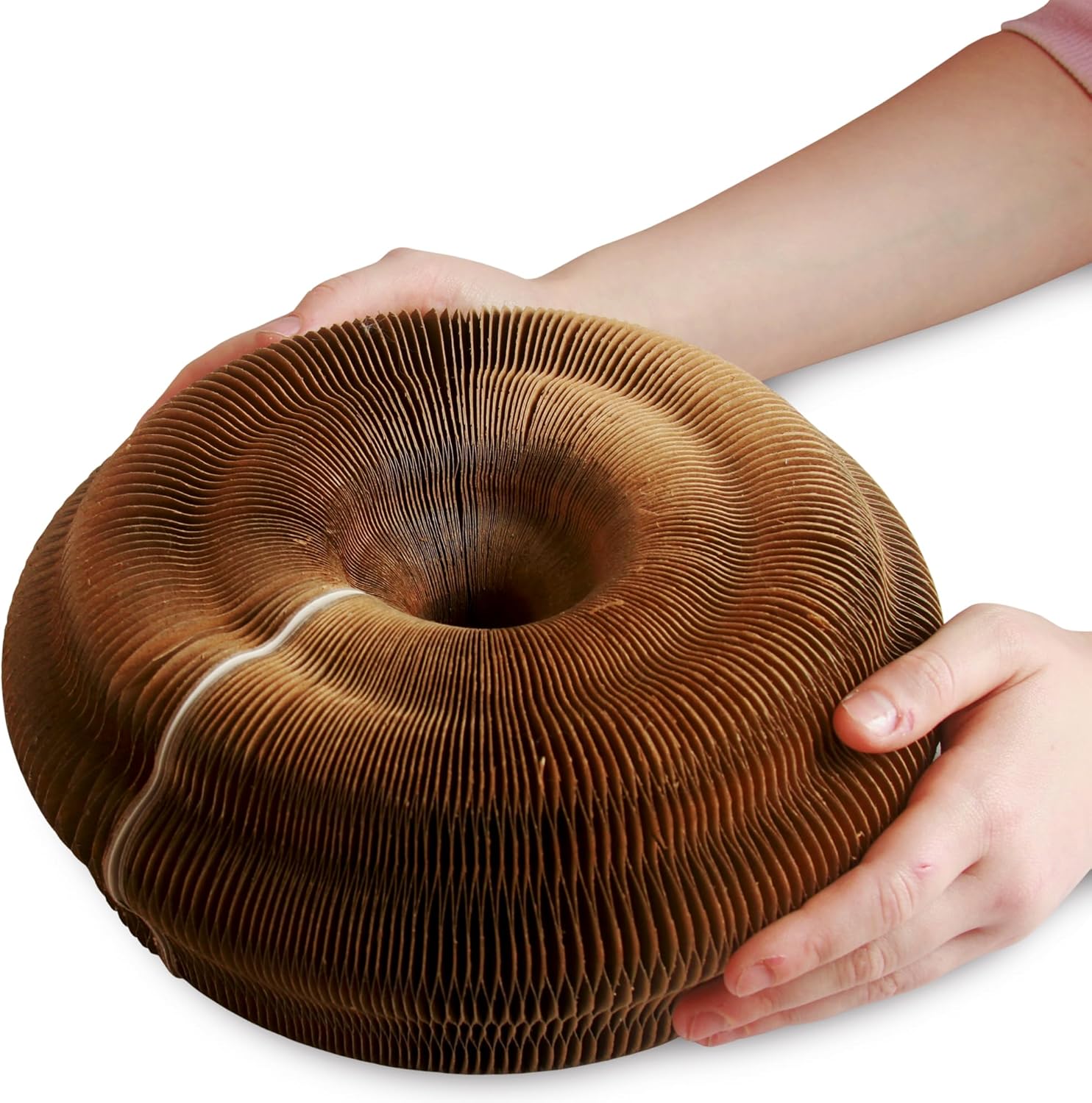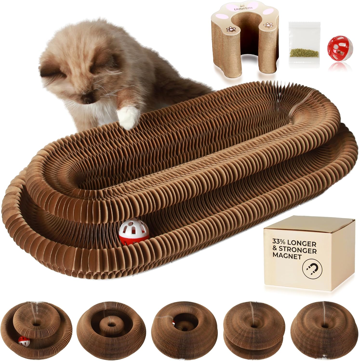 About this item Longer Than Standard Styles: At 8cm compressed vs. others at 6cm, this cardboard cat toy stretches into wide circles your cat can fit inside, manipulate during play, and reshape to their preference for more engaging cat enrichment. Connect two for an even bigger toy Stronger Magnetic Hold with 4 Magnets: Unlike standard accordion toys with only 3 magnets that pop open mid-play, our 4-magnet design keeps ends securely connected during batting, pouncing, and aggressive scratching sessions Helps Protect Furniture from Destructive Scratching: Corrugated cardboard satisfies your cat's natural scratching instinct while protecting couches and carpets; Serves dual purposes as both a scratching pad and interactive play surface Triple Sensory Stimulation Keeps Cats Engaged: The captured ball with bell triggers prey drive through sound and movement, while the included catnip activates their scent receptors, and the transformable shapes provide visual novelty Developed by Ragdoll Breeders with 15+ Years Experience: Our magic organ cat scratcher toy was tested by real cats in a working cattery; It combines mental stimulation, physical exercise, and claw maintenance in one innovative design › See more product details