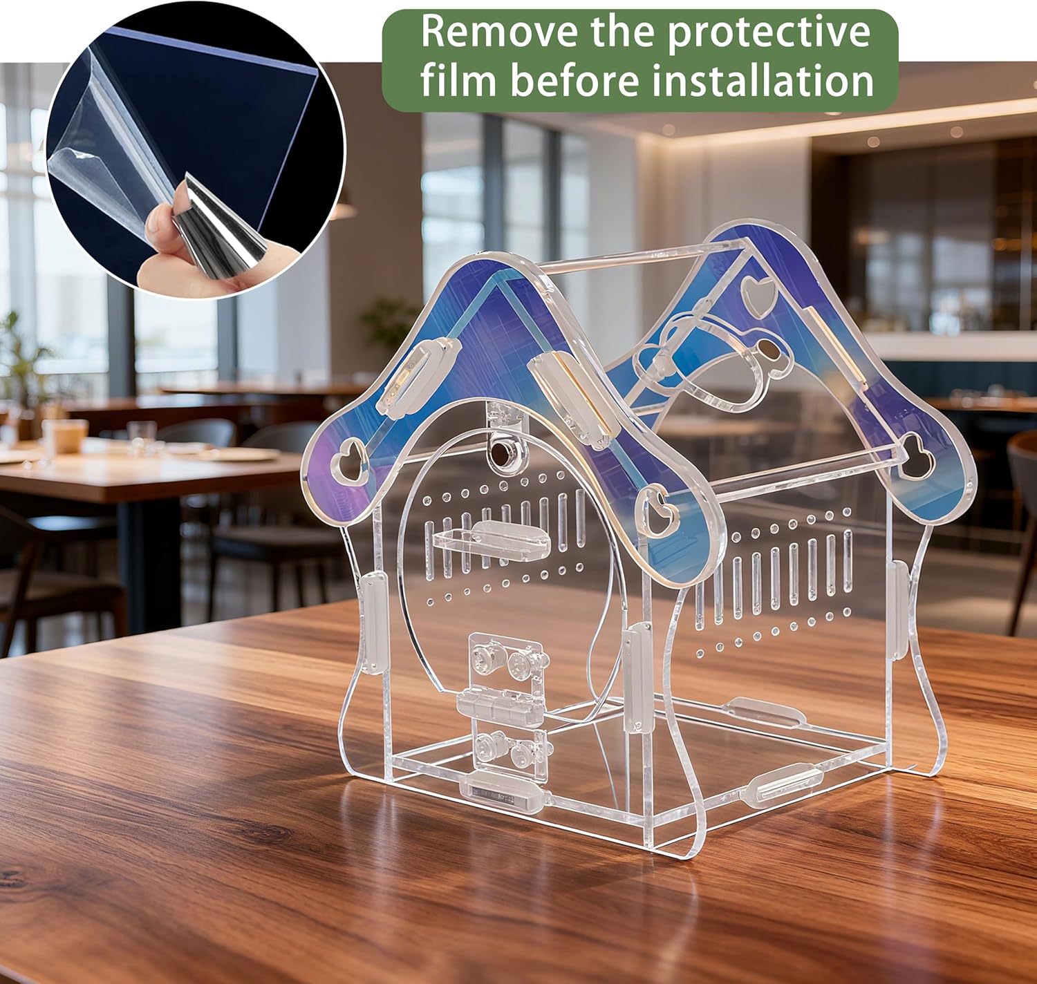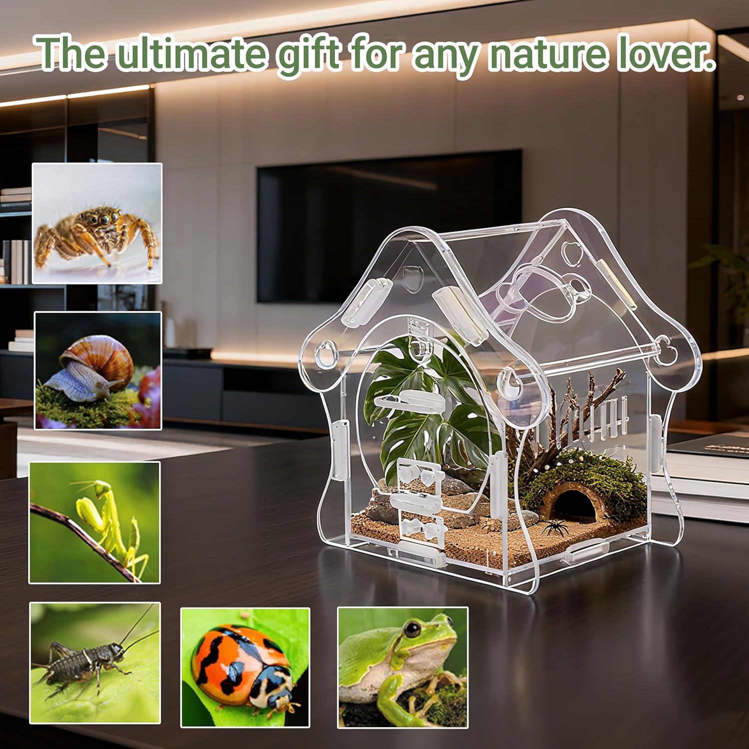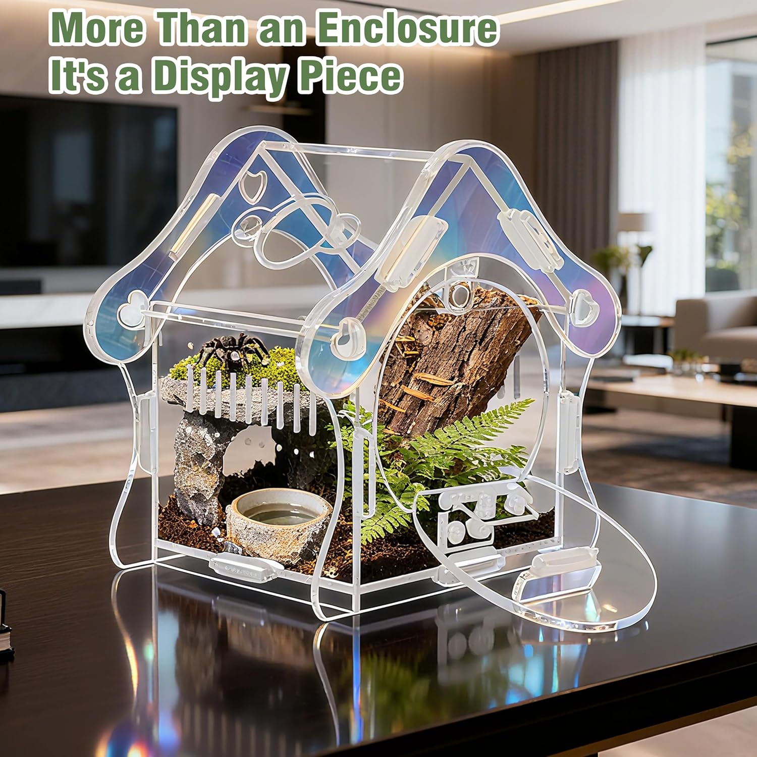 About this item Magnetic Feeding & Security System Features a TOP magnetic feeding door for easy food access and a SECURE front magnetic lock to prevent escapes, ensuring your spider's web remains undisturbed and your pet stays safe. Crystal-Clear 3mm Acrylic Construction Made of durable, lightweight 3mm acrylic that offers a clearer view and is stronger than glass. Enjoy 360° panoramic viewing and excellent ventilation for your pet's health and happiness. Enchanting Mushroom House Design This cute mushroom habitat (Internal: 3.5"L x 3.5"W x 4.9"H) provides ample space for jumping spiders, praying mantises, small tarantulas, beetles, scorpions, and other tiny insects. Quick & Easy No-Tool Assembly Everything included: 1x acrylic enclosure, 1x tool, and accessory pack. Just peel, assemble, and secure with bands. Your pet's new home is ready in minutes! Hassle-Free Cleaning & Maintenance The front-opening design allows easy access without damaging the top web. Removable parts and an escape-proof seal make cleaning simple and stress-free. › See more product details