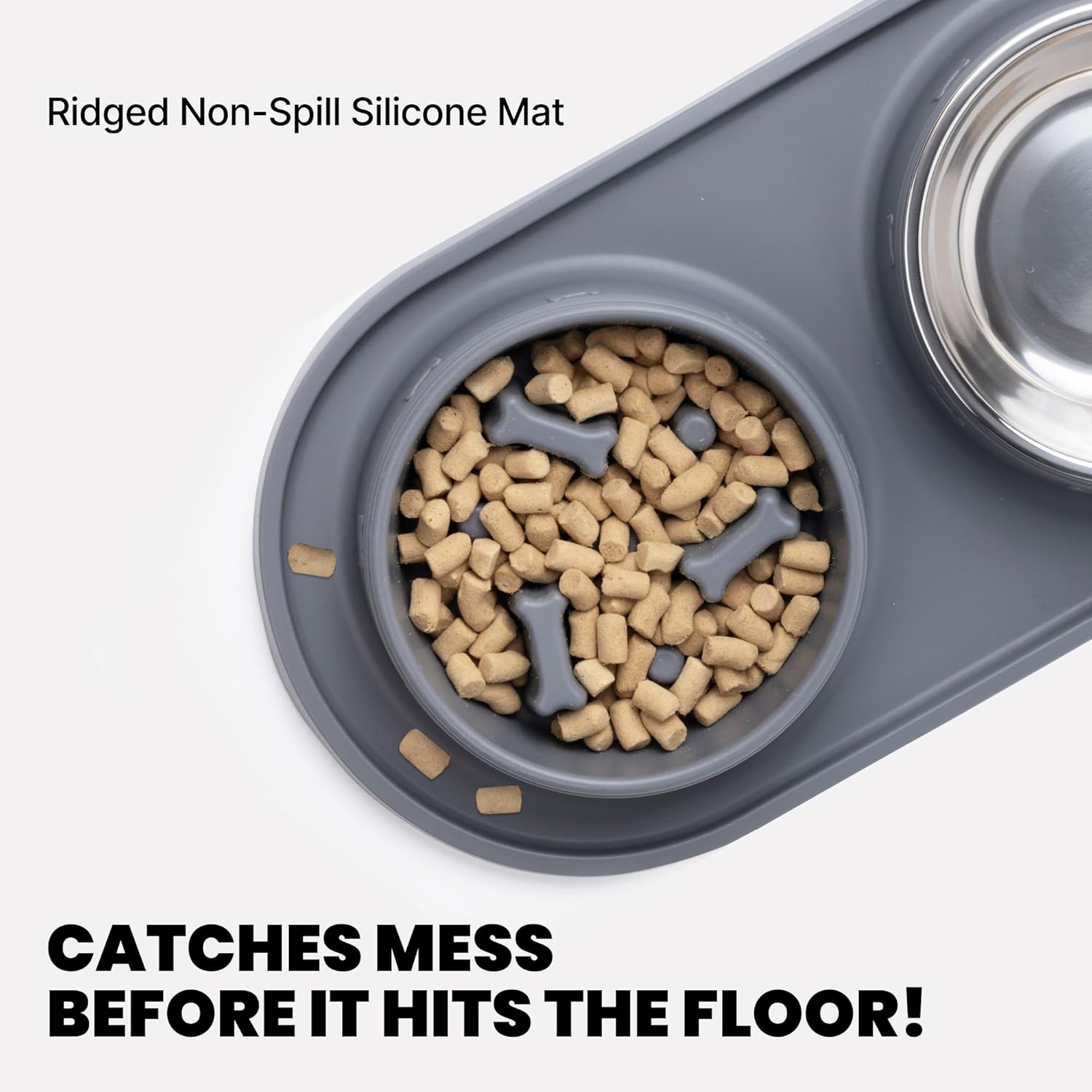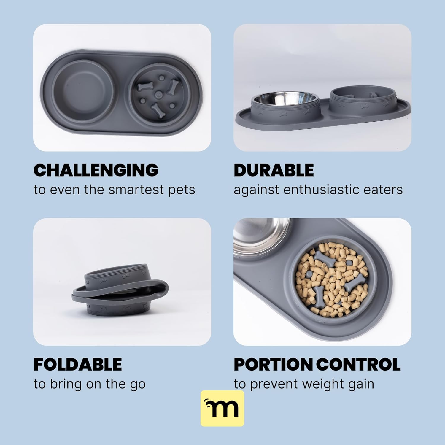 About this item Slow Eating Benefits: Got a pup that scarfs down food too fast? Our dog bowl slow feeder set with fun obstacles will help your pet slow down, cutting down the risk of choking, vomiting, and bloating. These slow feeder dog bowls are ideal for energetic eaters and great as a puppy slow feeder bowl for training Ultimate Feeding Station: This dog food and water bowl set includes a 15oz stainless steel slow feed dog bowl and a 15oz dog water bowl, all on a non-spill mat. Say goodbye to messy floors and hello to stress-free mealtimes with our dog food bowl set. The perfect puppy food and water bowl set for a clean and happy dining experience Travel Friendly & Tough: Our slow dog feeder bowl is made from foldable, lightweight silicone. This silicone dog bowl set is super easy to bring along on your adventures. The Malsipree's durable bowl set is built to handle even the most energetic pets, promising years of fun mealtimes No Mess Mat: Our dog bowls slow feeder set comes with a non-spill silicone mat to keep everything in place and catch spills. The stainless steel water bowl set is dishwasher safe. Our puzzle feeder dog and cat bowl make cleanup a breeze Perfect For Small To Medium Pets: This slow eating dog bowl or slow feeder dog bowl is just right for small dogs, cats, puppies, and medium breeds. Enjoy a chill mealtime with our puzzle bowl dog feeder. Your pets will love our slow feeder puppy bowl set! › See more product details