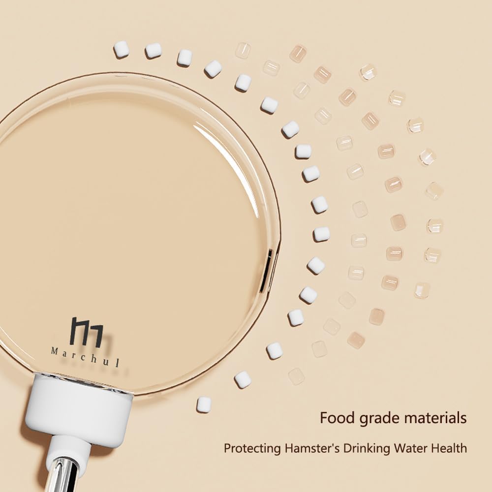 About this item Marchul Hamster Water Bottle with Sticky Hook & Clips for Acrylic hamster tank and Cages with width less than 0.4inch Novel shape: Unique and beautiful design, suitable for landscaping and decoration of cages. The hamster water bottle specially designed for small sized pets like hamsters, mice, dwarf, gerbils, rats, guinea pigs and meets their daily drinking needs very well Food grade material: Environmentally friendly ABS materials make the surface of this hamster water bottle smooth, which can take good care of the health of your furry friends. Protect your hamster's health Beautiful Water Bottle: The capacity of this hamster water bottle is 5.3oz/150ml. Its transparent material looks very beautiful Beautiful Water Bottle: The capacity of this hamster water bottle is 5.3oz/150ml. Its transparent material looks very beautiful Drip proof design: Our water outlet adopts a double ball design, which can adjust the water amount, avoid overflow, and make it easier for hamsters to drink › See more product details