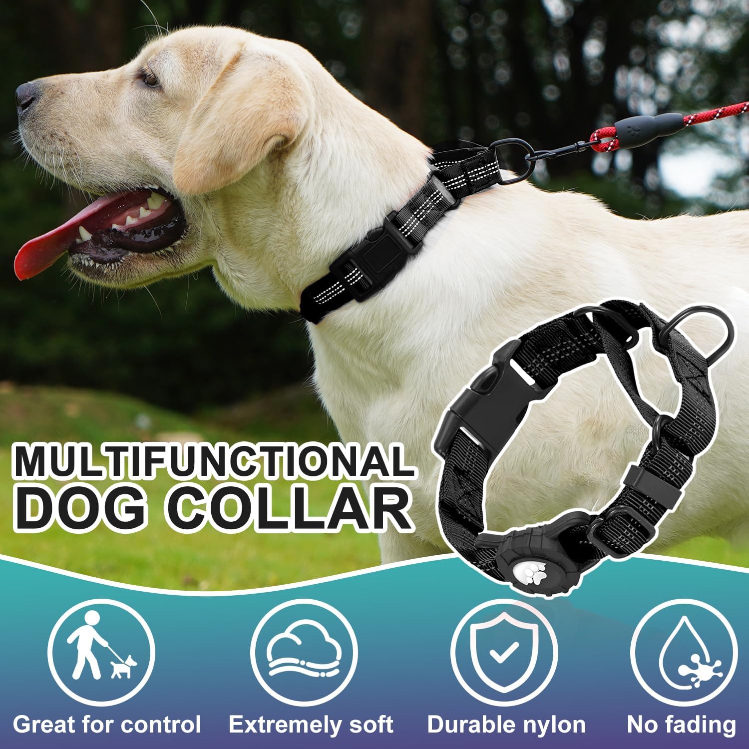 Experience superior control and safety with this Bcadem Martingale dog collar, thoughtfully designed for small, medium, and large dogs. The innovative no-pull design features a sliding mechanism that provides gentle control when your dog pulls, making it an excellent training tool. Crafted from durable nylon with reinforced stitching and rust-proof metal hardware, this collar ensures lasting performance. The quick-release buckle allows for easy fitting while maintaining security during walks. Built-in reflective strips enhance visibility during evening walks, keeping your furry friend visible in low-light conditions. The collar includes a convenient silicone AirTag holder, adding an extra layer of security for your peace of mind. For proper fitting, the collar should allow just enough room for two fingers between the collar and your dog's neck. Note: This collar is designed for leashed walks only and should not be used for indoor wear or without supervision. The combination of practicality, safety features, and training functionality makes this collar an essential accessory for responsible dog owners.