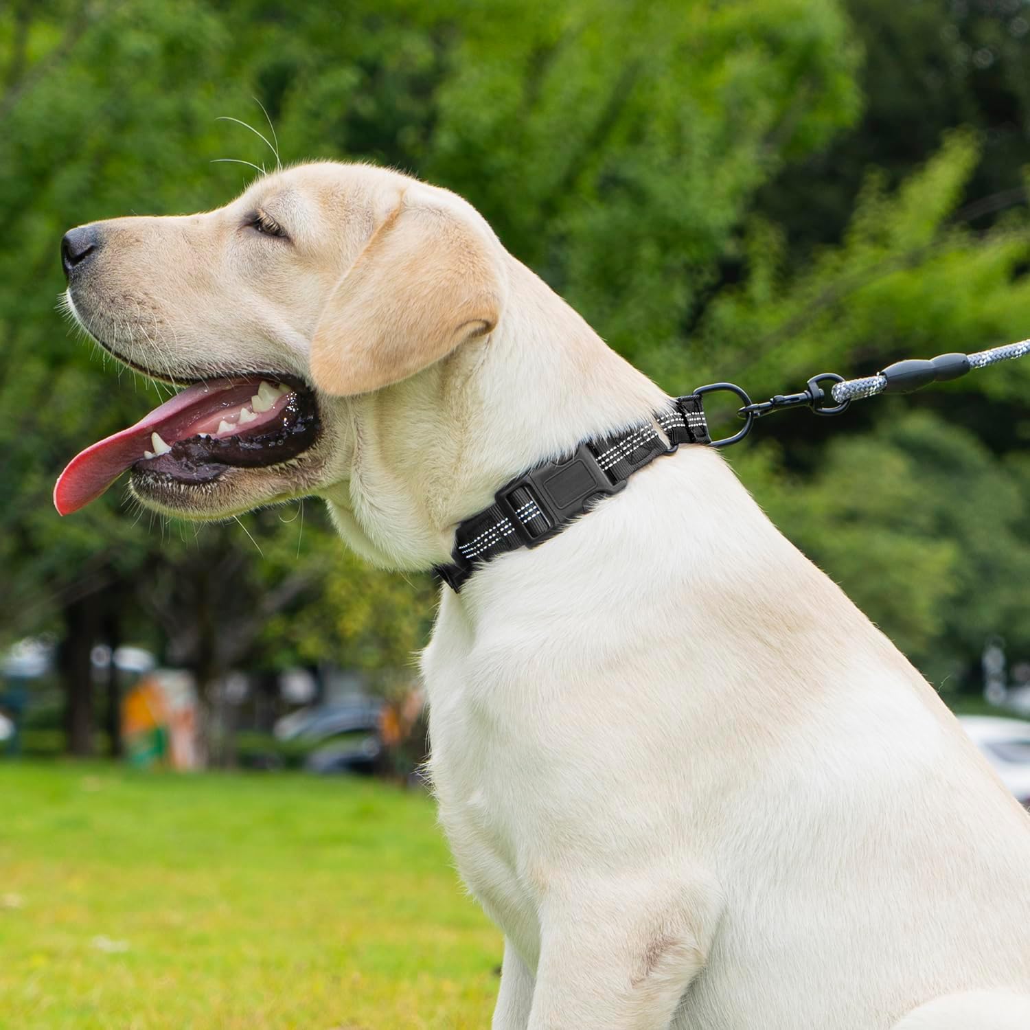 Experience superior control and safety with this Bcadem Martingale dog collar, thoughtfully designed for small, medium, and large dogs. The innovative no-pull design features a sliding mechanism that provides gentle control when your dog pulls, making it an excellent training tool. Crafted from durable nylon with reinforced stitching and rust-proof metal hardware, this collar ensures lasting performance. The quick-release buckle allows for easy fitting while maintaining security during walks. Built-in reflective strips enhance visibility during evening walks, keeping your furry friend visible in low-light conditions. The collar includes a convenient silicone AirTag holder, adding an extra layer of security for your peace of mind. For proper fitting, the collar should allow just enough room for two fingers between the collar and your dog's neck. Note: This collar is designed for leashed walks only and should not be used for indoor wear or without supervision. The combination of practicality, safety features, and training functionality makes this collar an essential accessory for responsible dog owners.