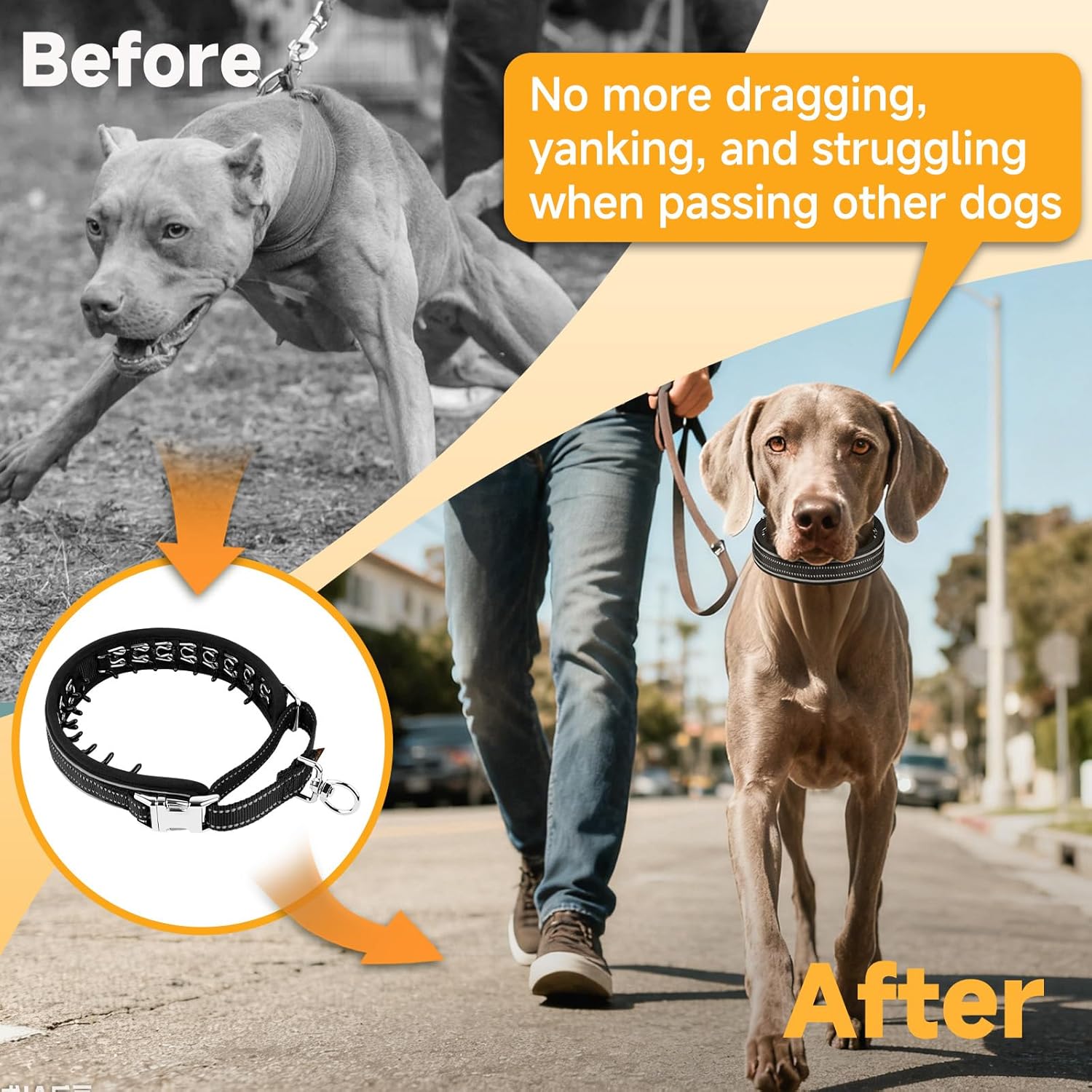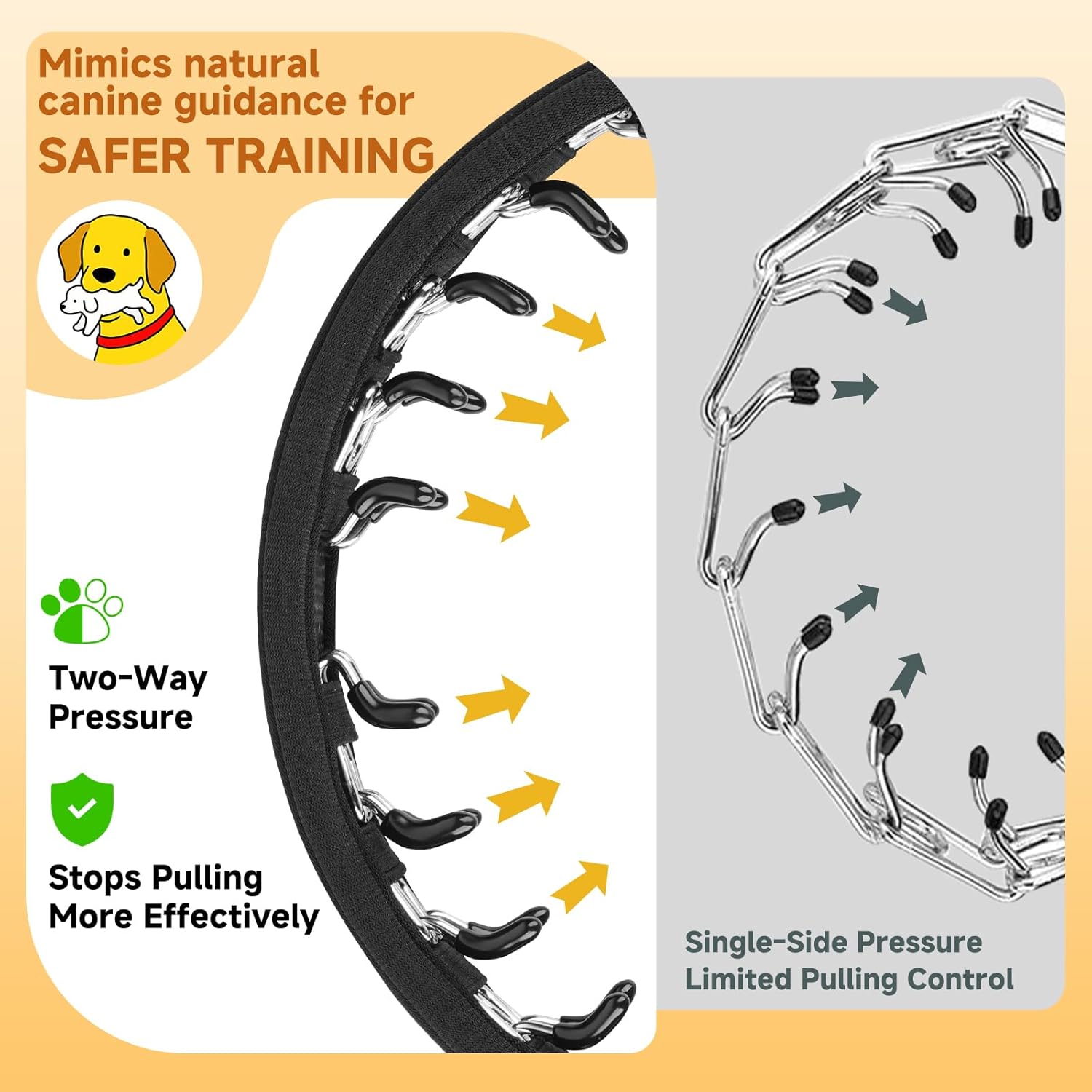 About this item Martingale Collar for Dogs(Medium, 15.75"-17" Neck): Mayerzon no pull dog collar features a tightening loop that provides instant feedback without choking. This martingale dog collar for pulling tightens when your dog pulls and loosens when relaxed, keeping your dog comfortable and secure Scientific & Effective Correction: Evenly spaced 2.5mm dual-direction links apply gentle pressure, mimicking a mother dog’s natural correction. This anti pull dog collar helps reduce pulling, lunging, and chasing, promoting calmer walks and better leash manners Professional Training, Discreet Control: The no pull collar is designed for correct pulling without drawing unwanted attention. The built-in links are secured with elastic retention to prevent detachment. Ideal for walks or training, this dog no pull collar ensures gentle control in a sleek design 360° Rotating Ring & Secure Buckle: The zinc alloy swivel clasp allows easy leash attachment and rotates 360° to prevent tangling, making walks smoother. The dog walking collars for pulling also have a quick-release alloy buckle for easy on and off Keep High-visibility at Night: Made with premium reflective webbing, this dog collar no pull enhances visibility in low-light conditions for added nighttime safety. Whether you own a Beagle, Husky, German Shepherd, Pitbull, Belgian Malinois, Doberman, or Rottweiler, this dog anti pull collar is safe for any breed Proper Fit Instructions: Please measure before ordering. The dog pulling collar should sit high on your dog’s neck, just below the base of the skull, for best results. If the no pull collar for dogs still tends to slide down even when fitted correctly, that’s normal—using a wider backup collar or a shorter leash can help keep it in place Hassle-Available Service: If you experience any sizing or quality concerns with this martingale no pull collar, we're here to assist. Our priority is your complete satisfaction. Each dog pull collar comes with an instruction manual, please read it thoroughly before use › See more product details
