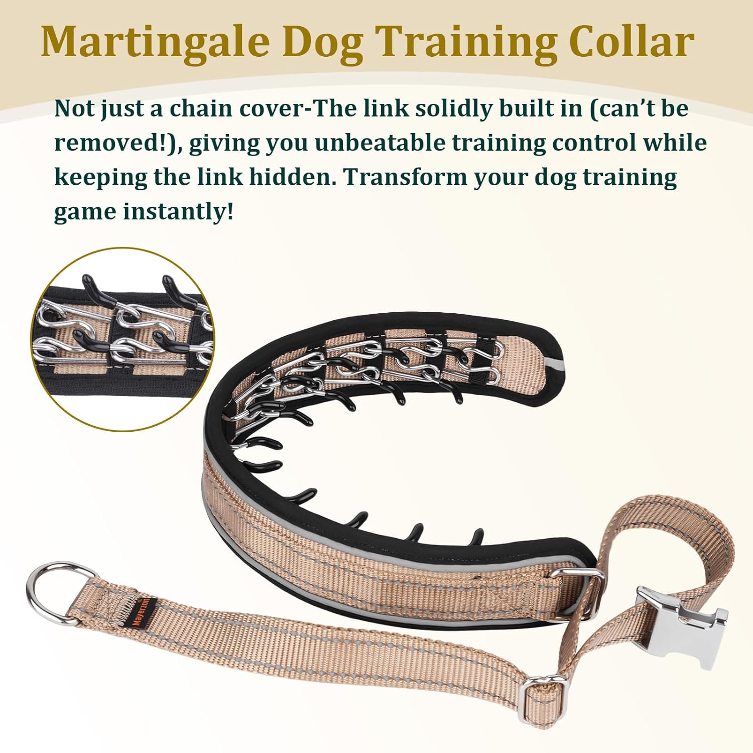 About this item Dog No Pull Prong Collar for Strong Pullers: Are you tired of being pulled around by your dog? This pinch collar for large dogs is a great help in controlling large, powerful dogs on walks. Suitable for German Shepherd, Pitbull, Rottweiler, Staffordshire, American Bulldog, American Bully, Boxer, Labrador, Belgian Malinois, and Doberman. Featuring a metal quick-release buckle, a martingale dog collar no pull is strong enough to handle tough pulls, and is easy to put on and take off. Hidden Prong Collar for Large Dogs: The martingale no pull dog collars for large dogs has a link built directly into it and is covered with a sturdy layer of nylon on the outside. This design not only makes the pinch collar look like a standard collar but also allows you the freedom to train among the public without the usual confrontation. Safe and Effective Way to Control Pulling: This dog walking collar no pull is a game-changer for correcting unwanted behaviors, stopping pulling. The dog training collar is also effective for obedience training and for situations where your dog needs to be calmer and more controlled. The links are capped with soft rubber, mimicking the feel of a mother's mouth on their neck for correction. This design provides gentle corrections without causing harm. Reflective Dog Pull Collar : The reflective strip of cover no pull training collar is primarily used forearly morning and late night walks. The dog walking collars for pulling enhances visibility, making it easier for cars to see your dog. Measure Before Buying the Quick Release Metal Martingale Dog Collars: Please measure before purchase and put the dog walking collars for pulling in the right position. The martingale collar for large dogs is meant to ride high on the dog's neck just below the base of the skull. The dog training collar no pull has a slider for length adjustment to get the perfect fit as your dog grows. If you have any questions about this large dog no pull collar to stop pulling, please feel happy to tell us. › See more product details