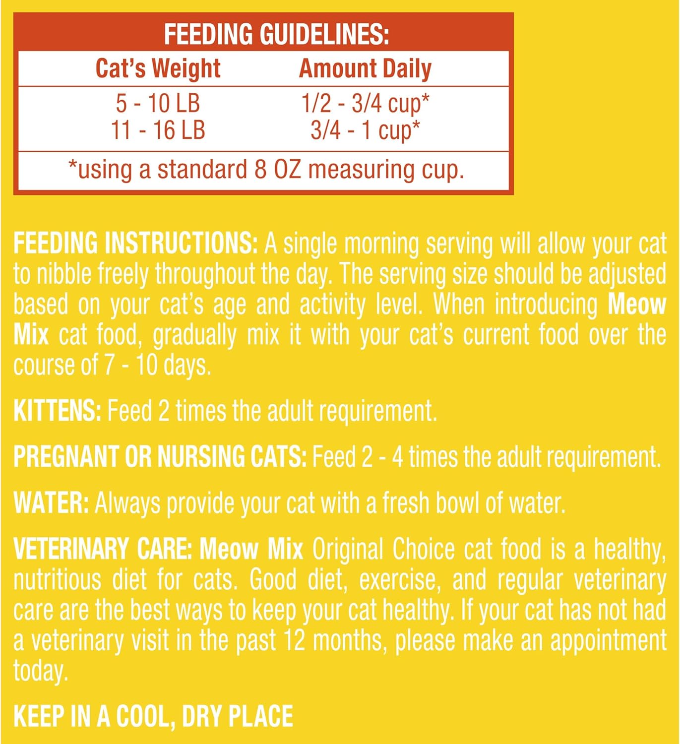 Delight your cat with the Original Choice for everyday nutrition — and taste that hits. Meow Mix Original Choice Dry Cat Food is made with the irresistible flavors of chicken, turkey, salmon and ocean fish to get ’em purring for mealtime. And you can feel the excitement too, knowing that this formula provides the one-hundred percent complete and balanced nutrition your cat needs every day. That includes 40 essential vitamins, minerals, amino acids and fatty acids, along with high quality protein that helps support a lean energetic body. And don’t forget the antioxidants, which help support a long, healthy life. With so much goodness packed into every bite, it’s no wonder why Meow Mix cat food is The Only One Cats Ask for by Name.