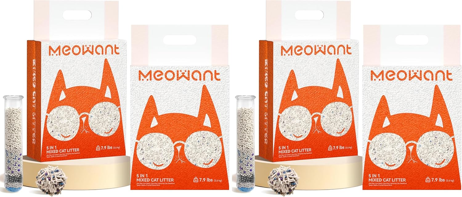About this item The information below is per-pack only 【5-in-1 Mixed Cat Litter】Meowant mixed cat litter adopts a scientific ratio, combining 65% tofu cat litter, 32% bentonite cat litter, 2% blue-purple deodorant beads, and adds zeolite, crushed mineral sand to improve stability. Mixed clumping cat litter is ideal for multi-cat households. 【Strong Absorption & Quick Clumping】Our natural tofu cat litter (7-16mm) absorbs moisture rapidly, forming tight clumps. The small bentonite particles help to fill the gaps in the tofu litter, increasing contact surface area and enhancing the litter's absorbency for quick clumping. It won’t stick to your pet’s paws or the litter box, keeping your litter box clean. 【Plant-Based Enzyme Odor Elimination Technology】Compound tea polyphenols and other plant extracts alters the microbial structure of pet waste, reducing activity and synergistically breaking down skatole—the primary source of fecal odor. Enhanced with O2-STA odor-lock technology and zeolite granules, it traps and neutralizes ammonia and stubborn smells, ensuring long-lasting freshness. 【Dust-Free & Low Tracking】Engineered with a 7-step vibration dust-removal process and vacuum-sealed packaging. The cat litter is hard and not easy to break, which can reduce dust in the air to protect the cat's respiratory system. Larger granules resist sticking to paws, reducing litter tracking and keeping floors spotless. 【Food-Grade Ingredients & Flushable】Our cat litter made from natural food-grade pea and corn fibers, safe and additive-free to ensure safe toileting for your feline. This cat litter can be dissolve in water and can be poured into the toilet (Note: pour small amounts of litter into the toilet multiple times to prevent clogging) › See more product details