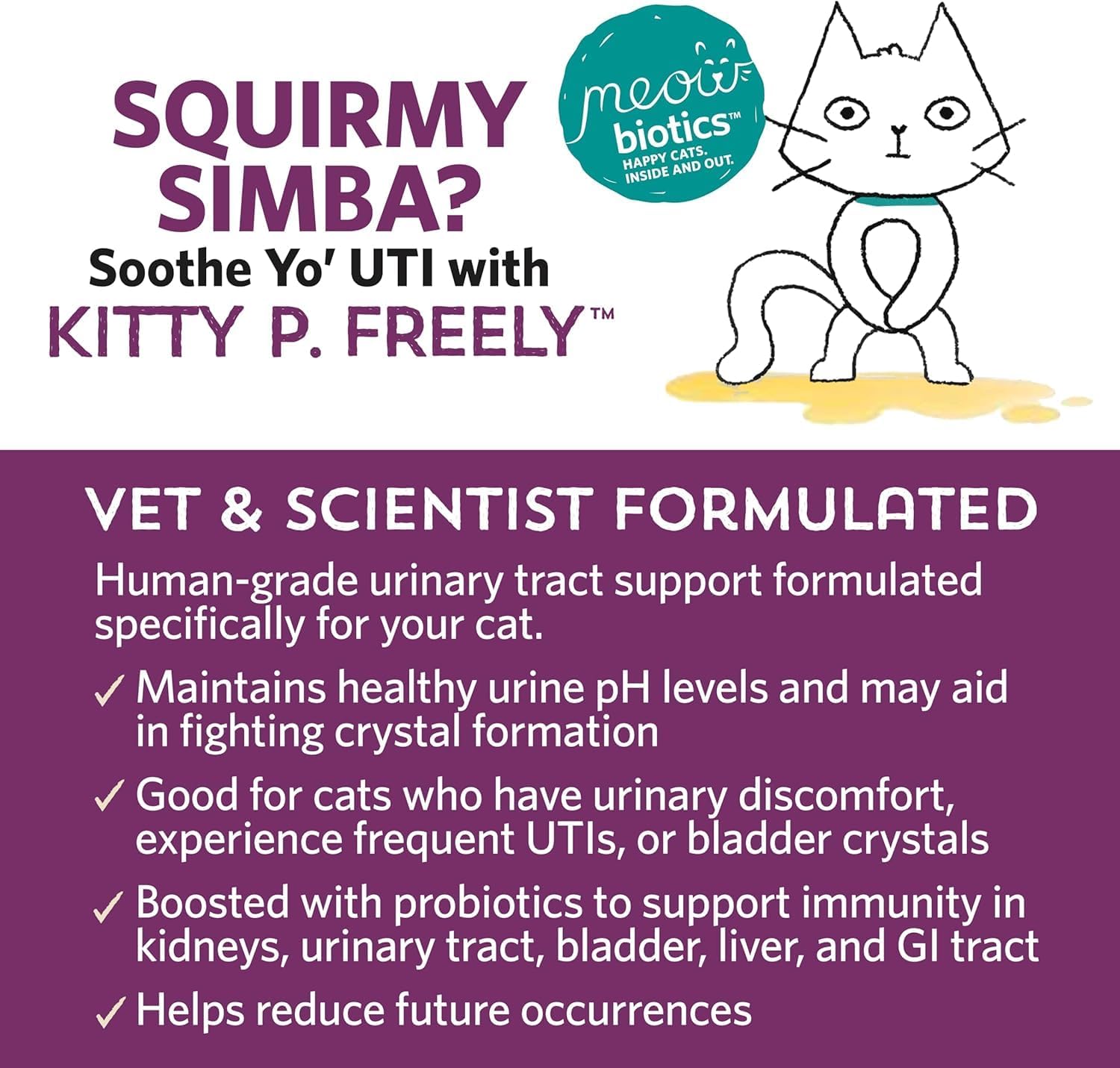 About this item All-IN-ONE CARE FOR YOUR CAT. From upset tummies to tricky litter box troubles—this variety pack keeps your feline feeling their best every day. Includes 1 x Good Guts Digestive Support and 1 x Kitty P. Freely for UTI & Kidney Care. THE SECRET TO HAPPY GUTS. Good Guts supports digestion, nutrient absorption, metabolic balance, and seasonal allergy relief so your cat feels great every day. URINARY PAIN? NOT ON YOUR WATCH. Kitty P. Freely supports comfy pee trips and keeps those pH levels cool, calm, and collected. EVEN PICKY KITTIES LOVE THESE FLAVORS. The Turkey & Cranberry and Big Kahuna Tuna flavors make adding probiotic powder to your cat’s meals both easy and tasty. STRUGGLING TO GET YOUR CAT TO TAKE SUPPLEMENTS? This variety pack makes daily care simple and stress-free. Give 1 scoop for adult cats, and ½ scoop for kittens—just sprinkle or mix into meals with no pills, no fuss, and no resistance, even from picky eaters. MADE FOR CATS. TRUSTED BY CAT PARENTS. Human-grade, non-GMO, gluten- and grain-free, crafted in the USA by probiotic experts who care as much about cats as you do. SAFE FOR EVERYDAY USE. These supplements can be given every day to support regular digestion and urinary comfort, and are especially helpful during times of stress, seasonal changes, or diet transitions. FROM PLAYFUL POUNCES TO COZY CUDDLES. Safe and effective for kittens, adults, and seniors— Whether they love to roam and play or snuggle and relax, these formulas support their well-being at every stage. PAIRS WELL WITH...EVERYTHING ELSE. Works with prescription diets, calming chews, joint supplements, and other supplements in your cat’s routine. LESS SCRATCHING, BETTER POOPS, HAPPIER VIBES. The wellness glow-up your cat didn’t ask for—but totally deserves. And you? Fewer messes and more cuddles Show more › See more product details