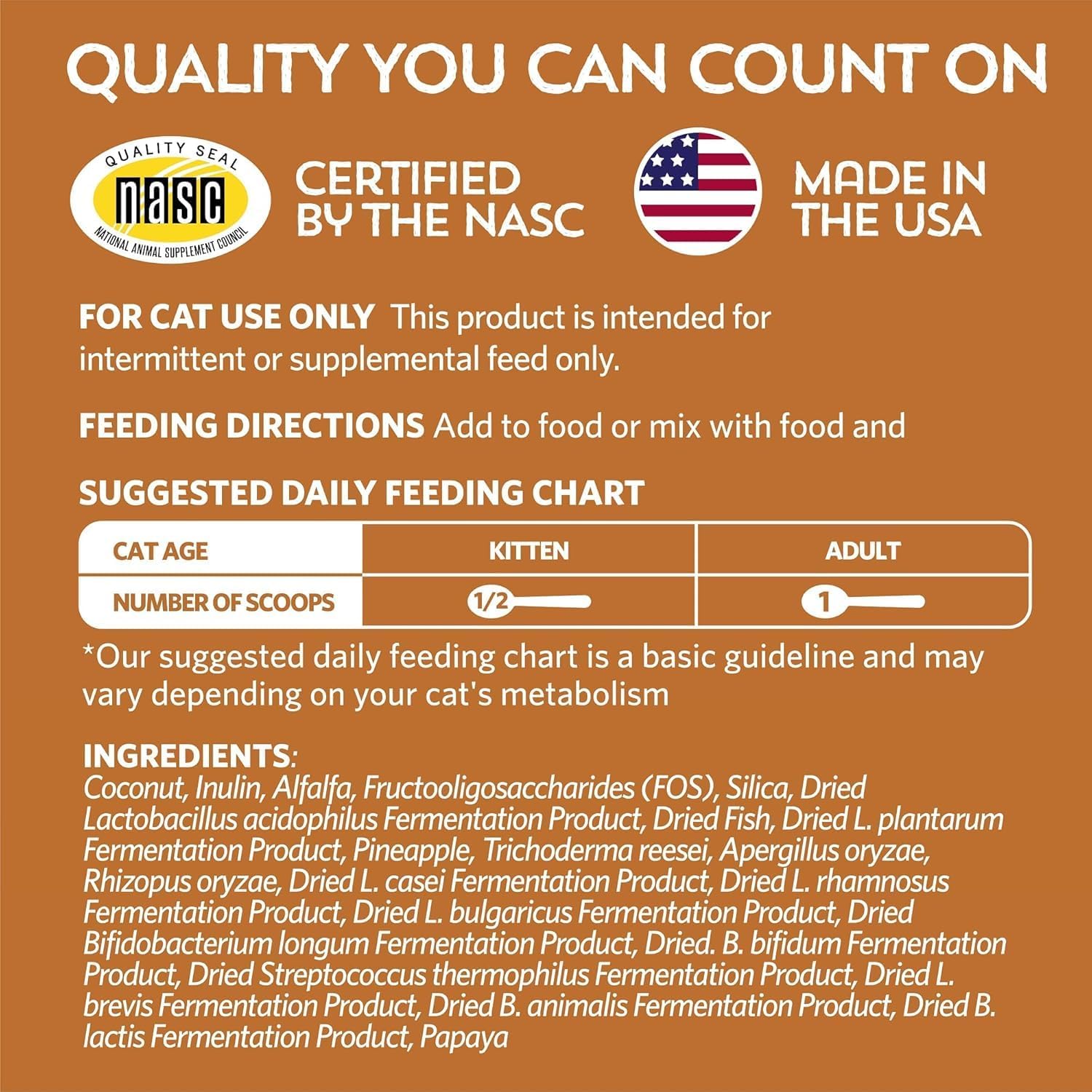 - Directions: Give during or after mealtime by mixing with dry or wet food. Use ½ scoop daily for kittens and 1 scoop daily for adult cats. Adjust the amount as needed based on your cat’s metabolism.