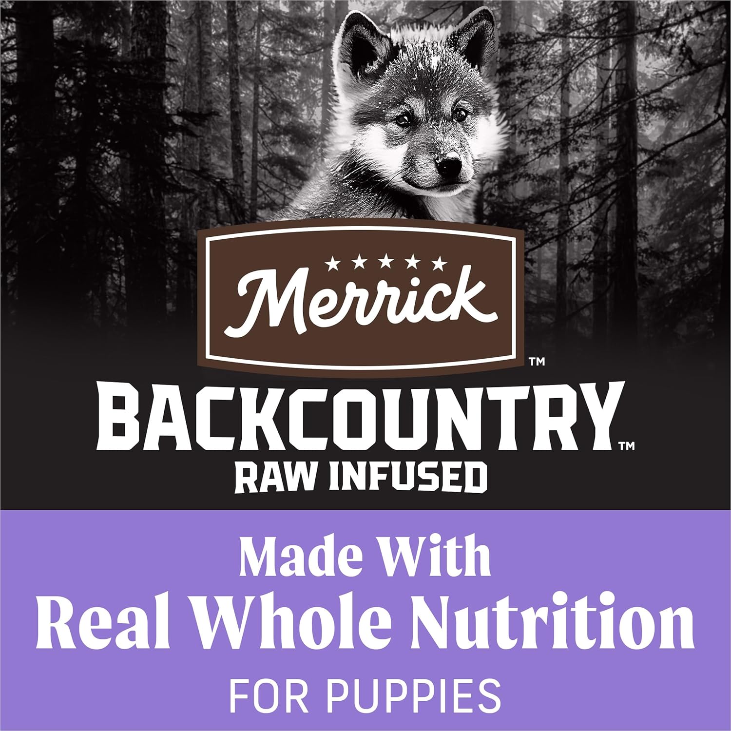 - Included Components: One (1) 4.0 lb Bag - Merrick Backcountry Raw Infused Grain Free Dry Dog Food Puppy Recipe