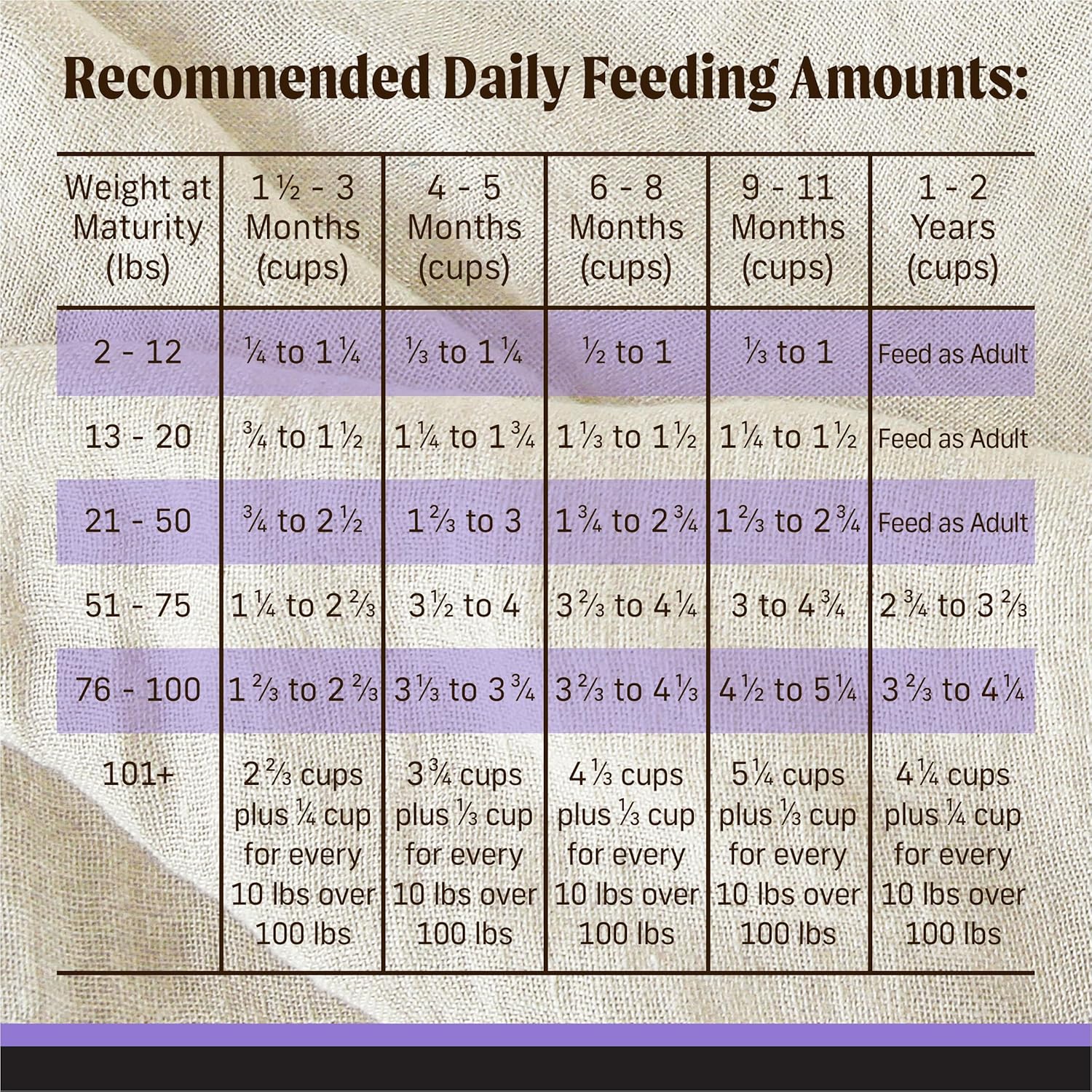 - Directions: Using the chart on the back of the product, divide the total cups per day by the total number of times you feed your puppy per day to determine the portion size for each meal. Keep a clean bowl of fresh water available at all times. Every puppy is a little different, so optimal feeding amounts may vary with age, size and activity level. Please use the information below as an initial recommendation only and adjust when needed. Dry and wet food in combination will help to increase the level of water in your puppy's diet. If feeding with wet food, reduce dry amount by 1/2 cup for every 6 oz. of wet food. Pregnant or nursing females may consume two or three times the recommended amount per day. For adult dogs, we recommend feeding 75% of the recommended amount for puppies 16-52 weeks of age.