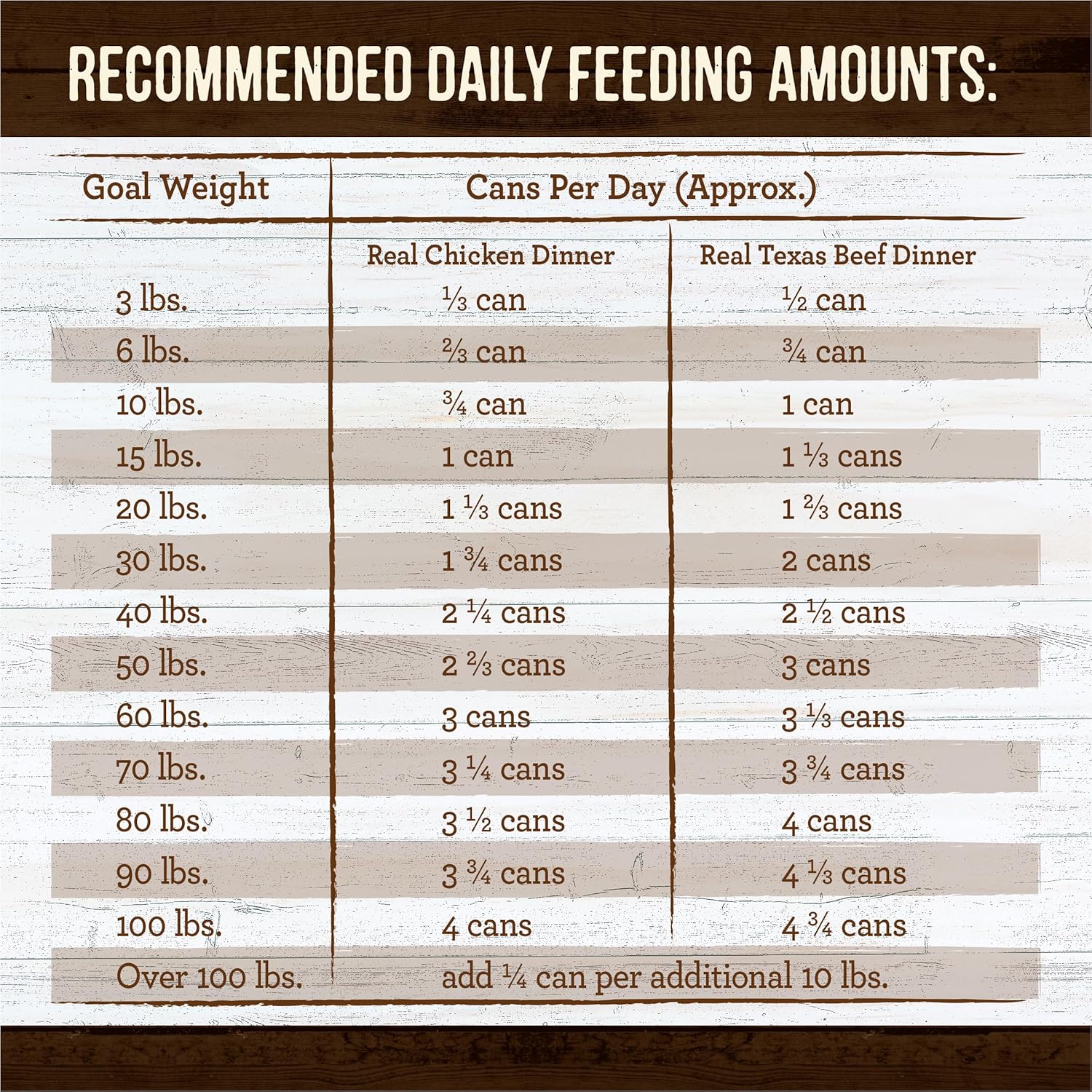 - Directions: For dogs over 100 lbs., add 1/4 can for each additional 10 lbs. Adjust feeding level to your dog's individual needs. Cover and refrigerate unused portions. Keep fresh water available at all times. If feeding with dry food, reduce wet amount by 6 oz. for every 1/2 cupe of dry food.