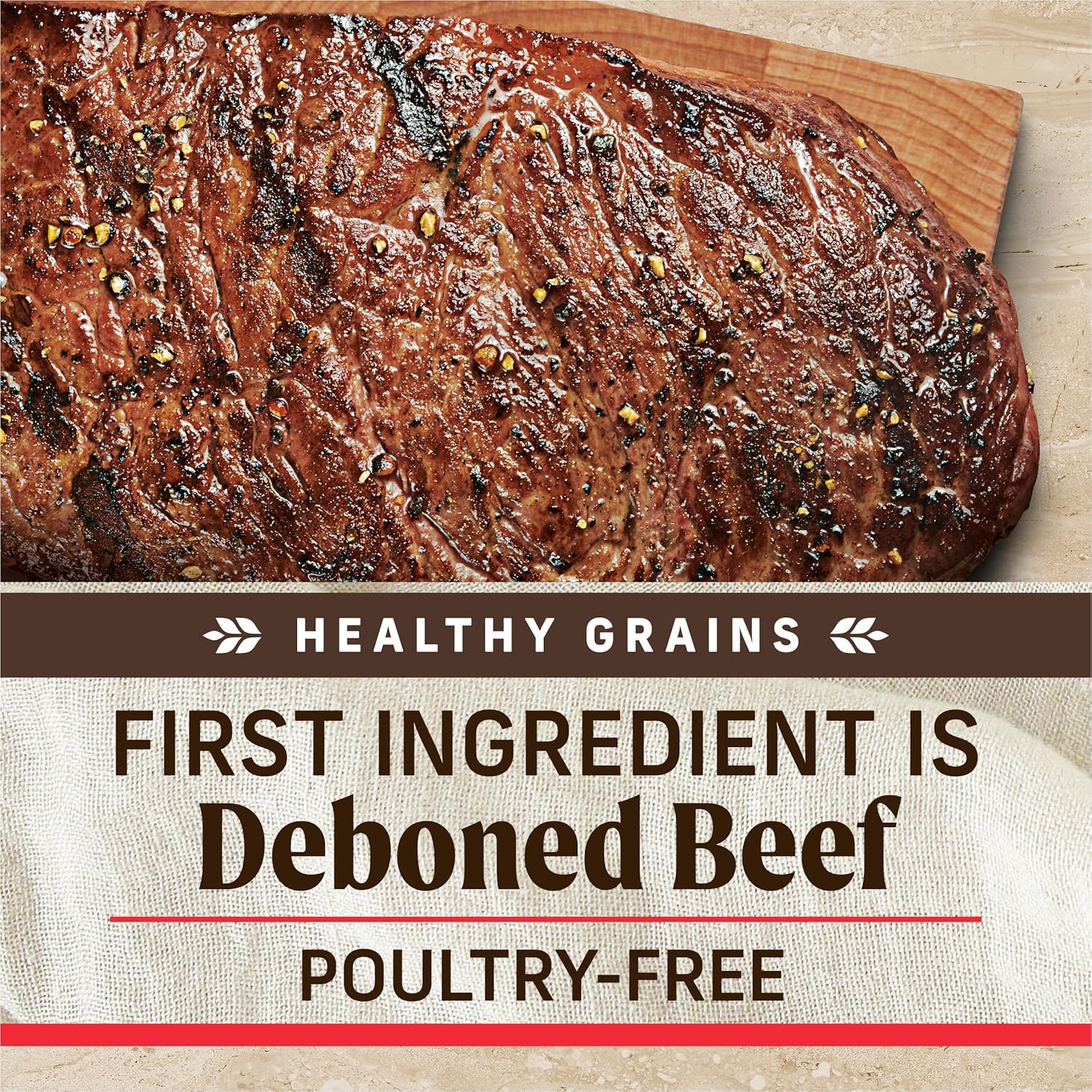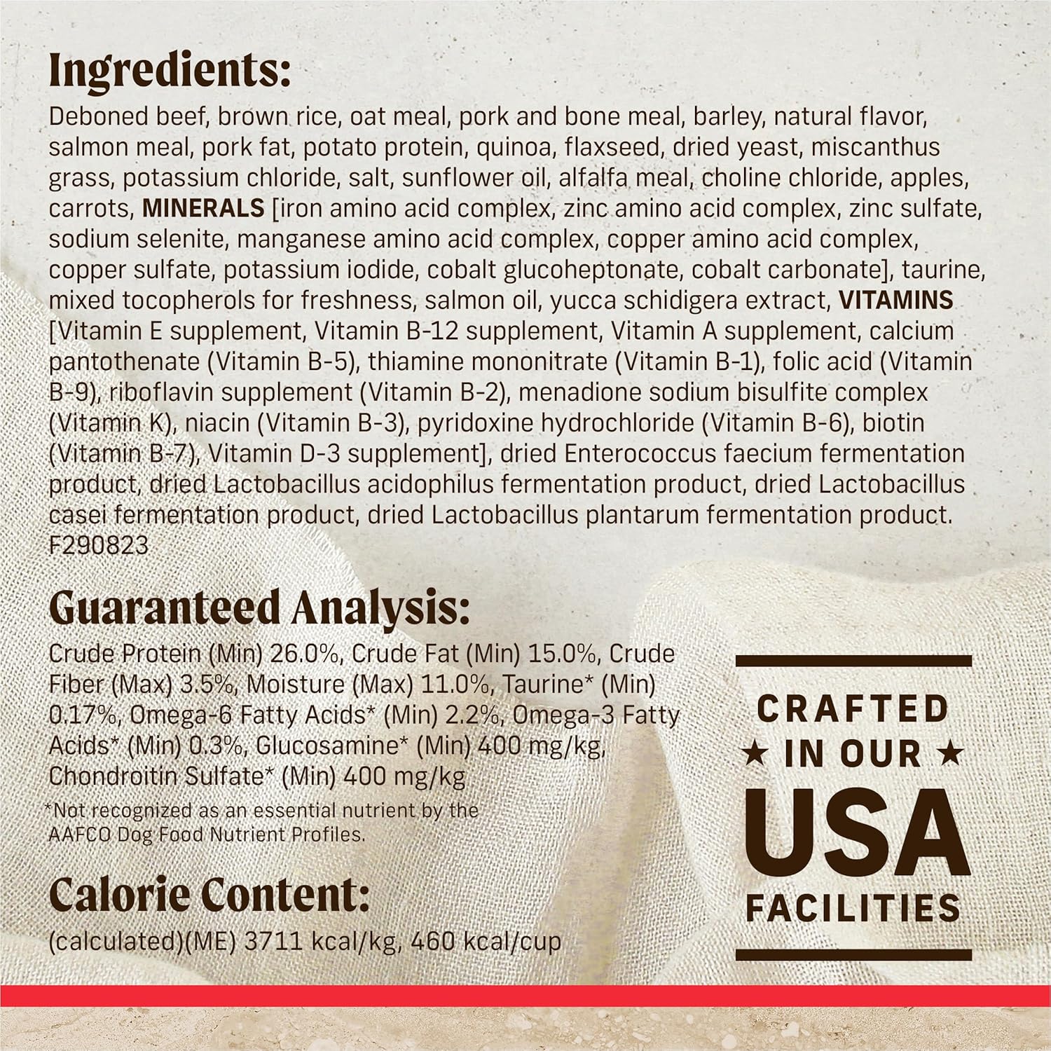 Offer your dog a healthy meal made with nutrient-rich ingredients with Merrick Healthy Grains Dry Dog Food, Real Beef and Brown Rice Recipe. Real deboned beef is the number one ingredient in this wholesome high protein dog food that helps maintain lean muscle mass and healthy energy levels. This premium kibble also contains a holistic blend of whole grains to create a delicious and natural, with added vitamins, minerals, and nutrients, whole grain dog food with oats that are easily digestible. Additionally, this beef dog food with brown rice contains Omega-6 and Omega-3 fatty acids to support healthy skin and coat. It also helps support healthy hips and joints through high levels of glucosamine and chondroitin for dogs. This wholesome kibble is a potato free dog food and is made without peas, corn, lentils, or soy to ensure a premium beef and rice dog food option. Merrick dry dog food recipes are proudly founded in Hereford, Texas, crafted in USA facilities.