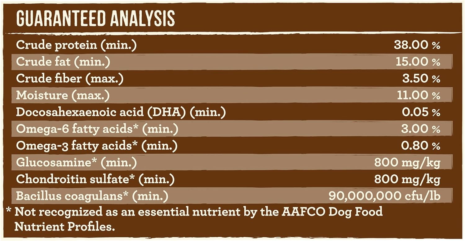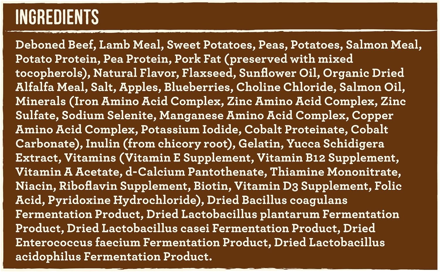 - Specific Uses for Product: Natural Grain Free Dental Hip & Joint Support Real Meat Digestive Health High-Protein Skin & Coat Gluten Free Corn Free Wheat Free Soy Free Easily Digestible Muscle Support Vitamins & Minerals Maintenance No Artificial Colors No Artificial Flavors No Artificial Preservatives