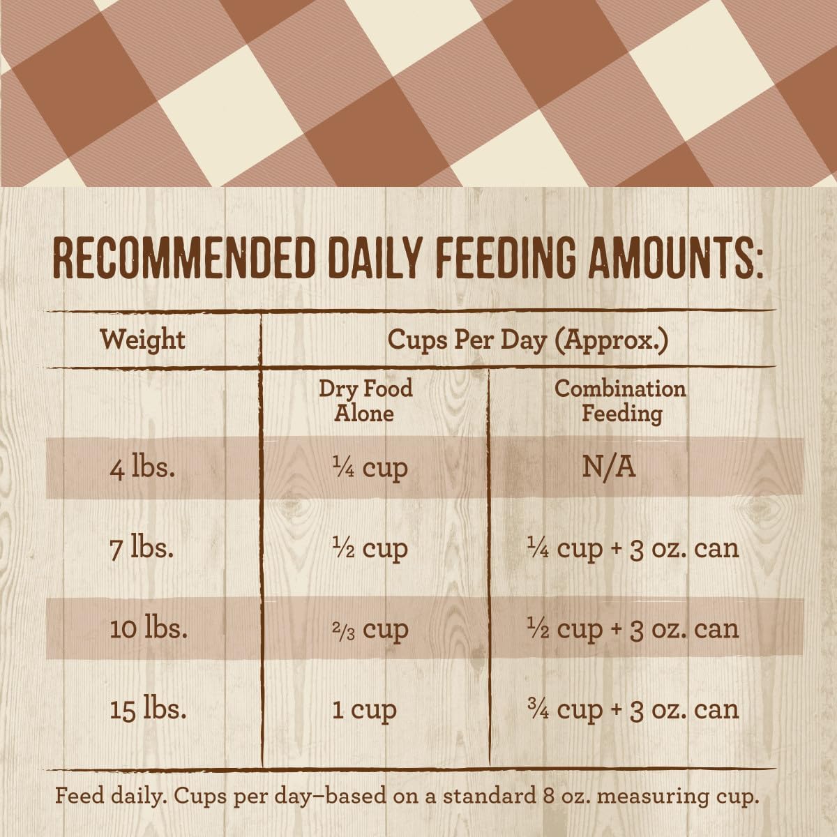 - Directions: Merrick Purrfect Bistro Healthy Grains Real Chicken and Brown Rice Recipe cat food provides quality, 100% nutritionally complete and balanced diet for cats and kittens. Kittens and pregnant or nursing females may consume two to three times the recommended amount.. We believe in feeding canned and dry in combination, whenever possible, to help increase the level of water in your cat's diet. Please have clean, fresh water available at all times. We understand that every cat is different and that optimal feeding amounts may vary with age, activity level and environment. Sizes & Amounts-> Dry Food Alone 4 lbs-> 1/4 cup, 7 lbs-> 1/2 cup, 10 lbs-> 2/3 cup, 15 lbs-> 1 cup. Combined Food 4 lbs-> N/A, 7 lbs-> 1/4 cup + 3 oz. can, 10 lbs-> 1/2 cup + 3 oz. can, 15 lbs-> 3/4 cup + 3 oz. can. Feed daily. Cups per day - based on a standard 8 oz. measuring cup.