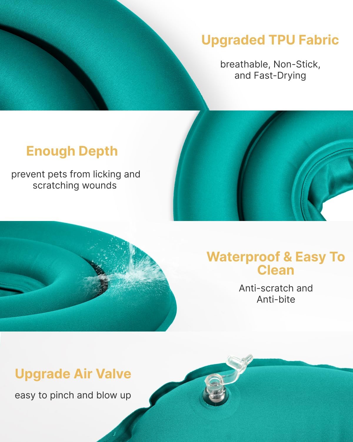 About this item Stress-Free Recovery Without Blind Spots|Maintain Full Vision: Ditch the cone of shame! Unlike traditional plastic e-collars that block sight and cause anxiety, our patented inflatable donut design allows your dog to see everything. This crucial difference reduces disorientation and stress, making the post-surgery healing process calmer and happier for your best friend Effectively Prevents Licking & Biting|Promotes Healing: The core purpose of a recovery collar is to protect, and ours excels. It creates a soft yet effective barrier that prevents your dog from reaching wounds, stitches, or rashes on their body. This crucial protection is key to a fast and complication-free recovery after medical procedures Eat, Drink, & Sleep in Comfort|Enables Normal Life: The biggest complaint with old-fashioned cones is how they disrupt daily life. Our soft donut collar is designed to let your dog eat from their bowl, drink water, and sleep in their favorite positions without the frustrating obstruction of a giant plastic cone getting in the way Pet-Parent Friendly Design|Easy to Clean & Store: We know convenience matters. The exterior fabric is upgraded to be non-stick, meaning pet hair won't cling to it. It’s a breeze to wipe clean. Plus, the inflatable design means when recovery is over, you simply deflate it for compact storage, ready for any future needs Secure, Adjustable Fit Stays On|For All Sizes: Worried about escape artists? Our collar features a robust adjustable rope buckle. You can achieve a snug, custom fit for your dog's neck and tie a knot for added security. It ensures the collar stays on to do its job, giving you peace of mind during their recovery. (Please measure your pet's neck based on our size chart for the perfect fit) COMPANY YOU CAN TRUST: Our company believes in attention to detail and traditional craftsmanship. We have been making high-quality dog donut cones since 2019, and have a wide range of other products for your pup. WARM PROMPT - Due to differences in dog breeds, body sizes, and growing environments, this comfortable dog cone may not be suitable for dogs with long noses, long legs, long tails, and long bodies › See more product details