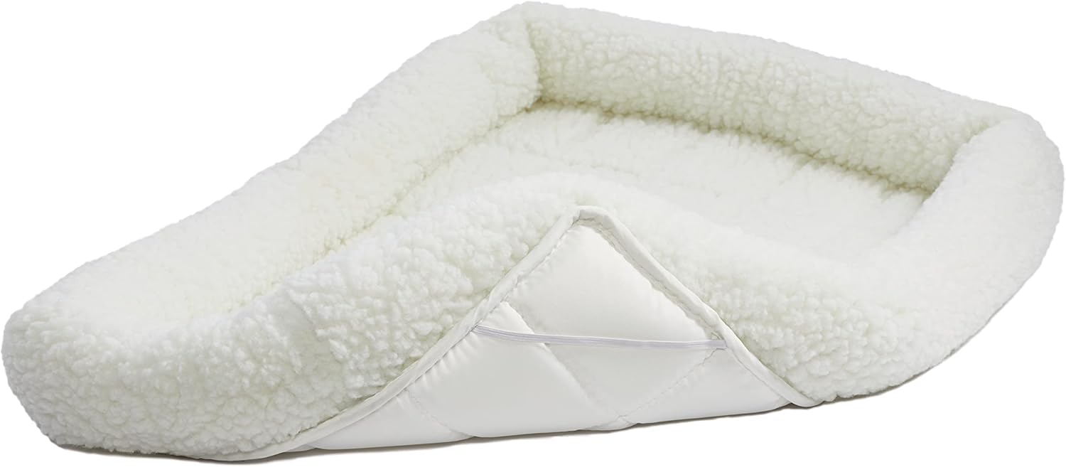 MidWest Homes for Pets is proud to offer the Quiet Time Bolster Fleece Pet Beds to provide your dog or cat with a soft, cozy & welcoming place to rest & relax. These comfortably padded pet beds are ideal for most standard folding metal dog crates, dog carriers, cat carriers, dog houses and work great as a stand-alone dog bed / cat bed anywhere in the house or when traveling with your pet. Each fleece pet bed is made of polyester with overstuffed bolsters around the perimeter creating a nice headrest adding to your dog or cats overall comfort. This fleece pet bed features a rectangular shape and is sized to fit most standard 18" long dog crates. Since these pet beds are machine washable / dryer friendly, they are easy to care for and built to last. The white fleece cream color helps conceal shedding & compliments any home décor. Please note that the Quiet Time pet bed is not ideal for excessive “chewers” or dogs with high separation anxiety. If your dog is an excessive chewer, we suggest keeping a chew toy with your pet when in the crate in hopes your dog will chew the toy and not the pet bed. MidWest Homes for Pets stands behind the quality of our products with a 1-Year Manufacturer's Warranty. If you have any questions regarding our dog beds or cat beds our customer service department would be glad to help you. MidWest customer service can be contacted at: 1-800-428-8560, available 9:00 AM - 4:00 PM, Monday - Friday EST.