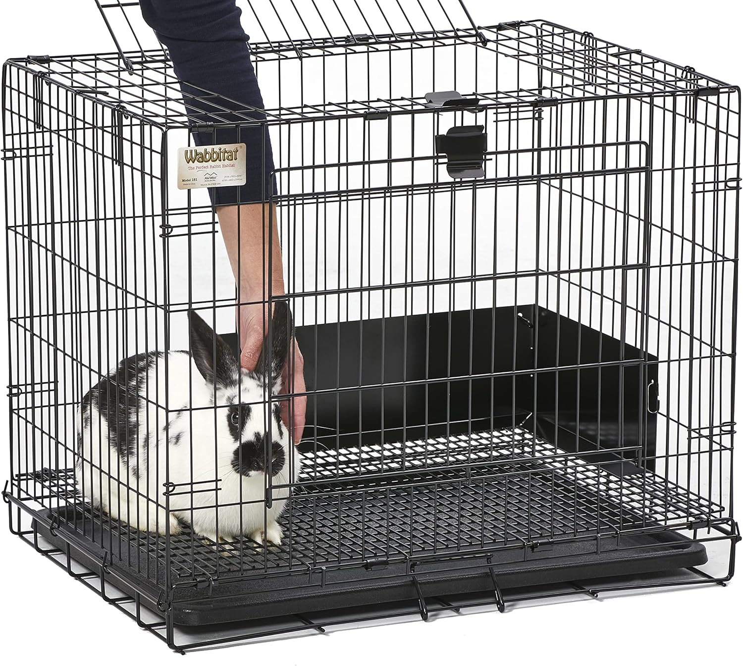 Product Description The perfect rabbit habitat. Black e-Coat Finish. Sets up complete in seconds. No tools required.Front and top doors and latch provides one-handed operation. Amazon.com Wabbitat is the perfect rabbit habitat. It’s durable, affordable, and it makes the best starter home for your furry family member. Wabbitat sets up easily in seconds with no tools or connecting pieces needed for assembly. It features unique slide-latches on the large top and front door openings for one-handed operation, allowing ease of use when interacting with your pet or taking him in or out of his home. The durable, slide-out ABS plastic pan with locking pan stop is also easy to install and remove for trouble-free cleaning and cage maintenance. MidWest researched the small animal category in great detail by inviting experts to educate our Research & Design team on the needs of small animals. We found that rabbits are bright, loving, and social animals that need interaction every day with humans or other rabbits. We also learned that rabbit enclosures must be easy to clean, which is vital to pet parents and their pets. Taking this information and adding our quality wire product knowledge resulted in the creation of a trusted line of excellent small-animal products. We ensure that our products are manufactured following strict quality assurance procedures, procedures that are conducted during each step in our manufacturing process and full-scale, random quality inspections during the year. Wabbitat carries a one-year limited warranty and support from MidWest’s award-winning customer service team. Product Features The perfect starter home for your Rabbit Sets Up Complete in Seconds – No Tools or Connecting Pieces Required Unique Design Provides Versatile Top and Front Door Access Secure Slide Latch Allows for One-Handed Door Operation Easy to Slide Out and Clean Front Access Durable Plastic Pan Includes Urine Guard, Protecting Surrounding Areas from Urine Splash ½” Grid Mesh Floor Supports and Hygienically Protects Rabbit’s Hocks Black Electrocoat Finish Provides Long Lasting Protection Cleaning Instructions Using a mild, pet-safe cleanser, use warm water to spray or wipe with a cloth. Avoid abrasive materials, harsh chemicals, and scrubbing as this may damage the finish. Lay the plastic pan flat to air dry and do not expose to prolonged periods of direct sunlight. Urine guard can be used with or without the floor grid