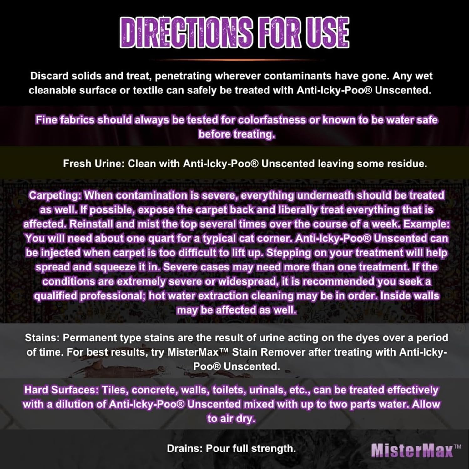 Our Mister Max original scent urine enzyme cleaner removes pet odors from carpet, hardwood floors, wood furniture, concrete, tile, and upholstery. It works as a cat spray odor remover, dog pee odor remover for indoor, and even urine odor remover spray for outdoors, delivering long-lasting odor control. The ready-to-use gallon size ensures you have plenty for large areas or repeated treatments, making it a reliable pet odor eliminator for strong odor problems. Formulated without added fragrance, this pet odor remover for carpet is ideal for sensitive households. It’s biodegradable and residue-free, leaving your home smelling light, fresh scent, or naturally fresh. This fast-acting pee spray cleaner enzyme for dogs and cats breaks down stains and odors on contact, serving as an effective enzyme cat urine cleaner, dog stain, or animal odor remover for carpets, furniture, and more. Easy to use and efficient, our feces or urine odor remover lifts and neutralizes deep-set odors to prevent them from returning. It also works as a dog poop and urine enzyme cleaner laundry solution for washable bedding and fabrics. Keep your home fresh and maintain a clean area using the powerful pet cleaner enzyme to remove stubborn messes, restore freshness, and keep your home clean and odor-free.