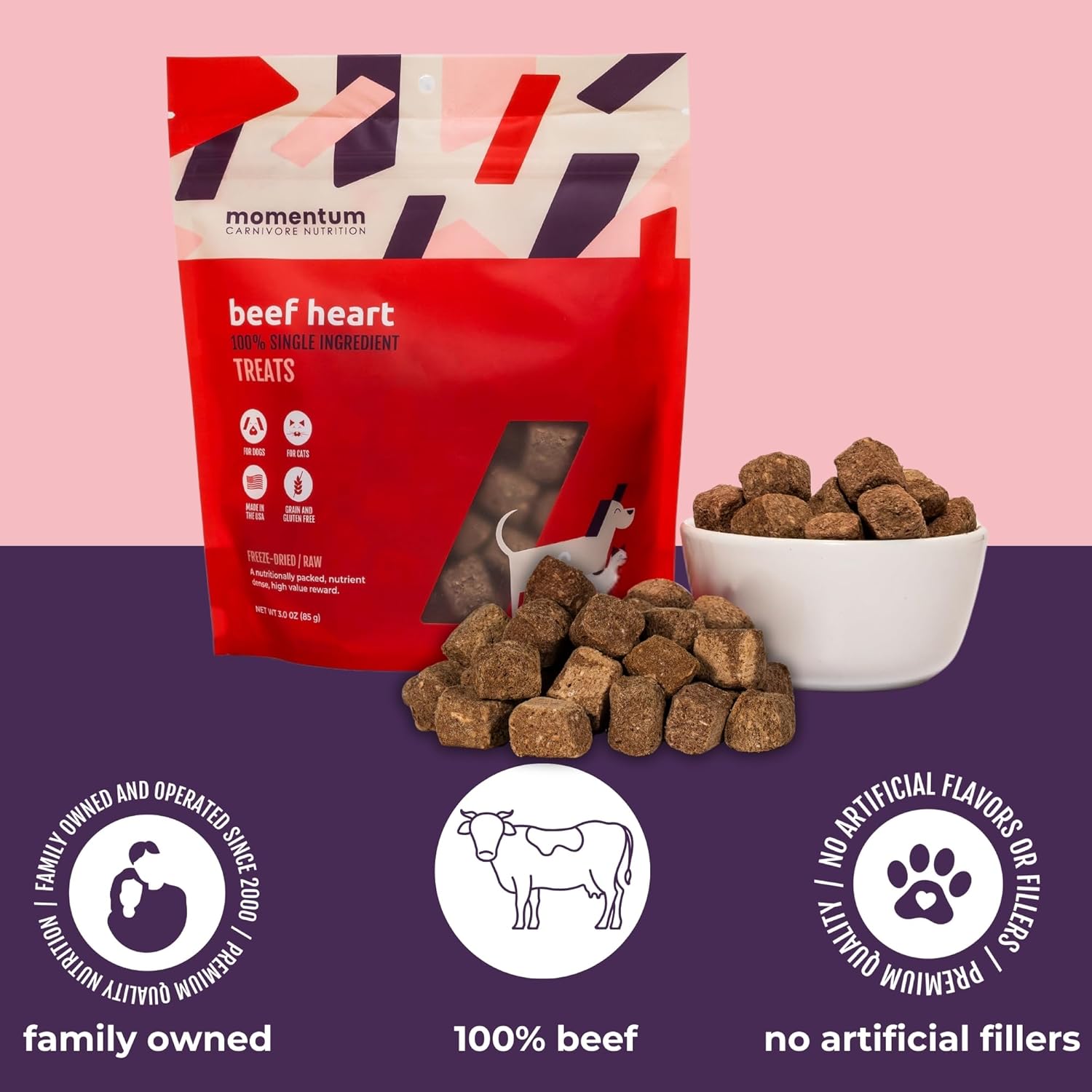 About this item 100% PURE BEEF HEART DOG TREATS – Made from a single ingredient—premium beef hearts—these all-natural freeze-dried dog treats deliver pure, protein-rich nutrition dogs crave and cats enjoy too NUTRIENT-DENSE FOR HEALTH & VITALITY – Packed with essential amino acids, iron, and taurine, these beef dog treats naturally support heart health, lean muscle development, and sustained energy for active dogs FREEZE-DRIED RAW DOG TREATS FOR MAXIMUM NUTRITION – Gently freeze-dried to preserve nutrients, flavor, and texture, creating a clean, high-protein dog treat that maintains the benefits of raw feeding GRAIN-FREE, GLUTEN-FREE & EASY TO DIGEST – Perfect for dogs with allergies or food sensitivities, these single-ingredient dog treats are made without grains, gluten, or additives for simple, natural nutrition PERFECT TRAINING TREATS FOR DOGS – High-value and easy to break apart, these dog treats are ideal for obedience training, positive reinforcement, or rewarding good behavior anytime VERSATILE DOG TREATS & MEAL TOPPERS – Serve as healthy, high-protein freeze-dried dog treats or crumble over meals to add flavor and nutrition for both dogs and cats MADE IN THE USA, FAMILY OWNED & TRUSTED QUALITY – Proudly sourced and freeze-dried in the USA by a family-owned company dedicated to crafting premium dog treats with real ingredients and no artificial additives › See more product details