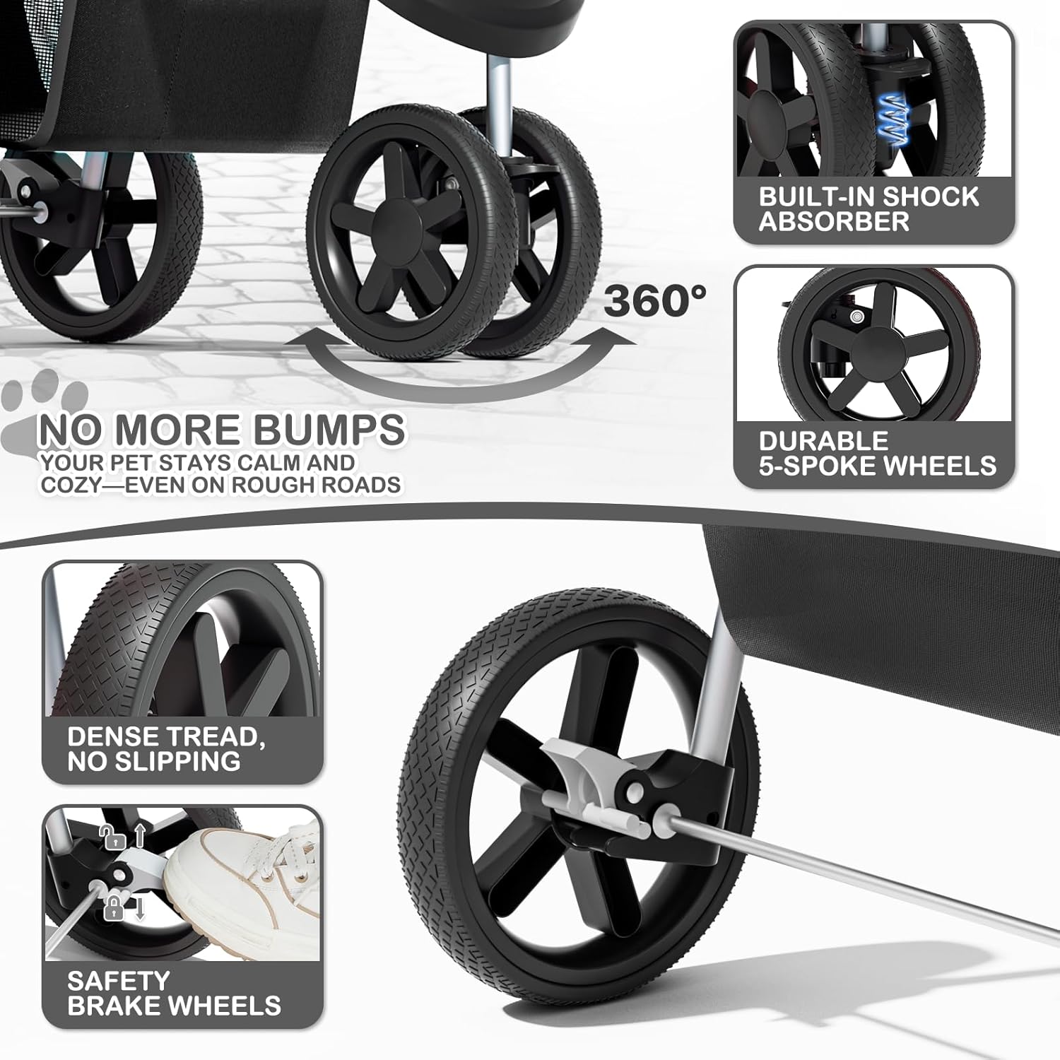 About this item Conveniently Collapsible Design - This dog stroller is the perfect solution for smaller or older pets who can't handle long walks. The collapsible design makes it ideal for travel and camping, and the lightweight yet sturdy support means you won't have to worry about anything. Sturdy and Safe - Our pet stroller is equipped with breathable mesh windows that allow your furry friend to see and breathe easily. The Oxford cloth material is water-resistant and durable, ensuring your pet's safety and comfort. Humanized Design - With convenient features like swivel front wheels, cup holders, and a hooded peak-top window, this pet stroller makes taking your pet out for exercise and fresh air an easy and enjoyable experience. The roomy design and undercarriage storage basket give you plenty of space to carry your essentials, too. Advanced Braking System - The two rear wheels of our pet stroller are equipped with brake protection devices, so you can park your stroller safely and securely even on inclined surfaces. Durable and Comfortable - Made of tough Oxford cloth and able to hold up to 33 lbs, our dog stroller is not only water-resistant but also provides added comfort with a padded foam bottom that your furry friend is sure to appreciate. Flexible Wheels - Finally, the 360° swiveling front wheel with a shock absorber ensures that your pet has a smooth ride even on the roughest terrain. The rear two wheels also feature brakes, making this stroller a perfect fit for injured or senior dogs or puppies that need a little extra TLC. › See more product details