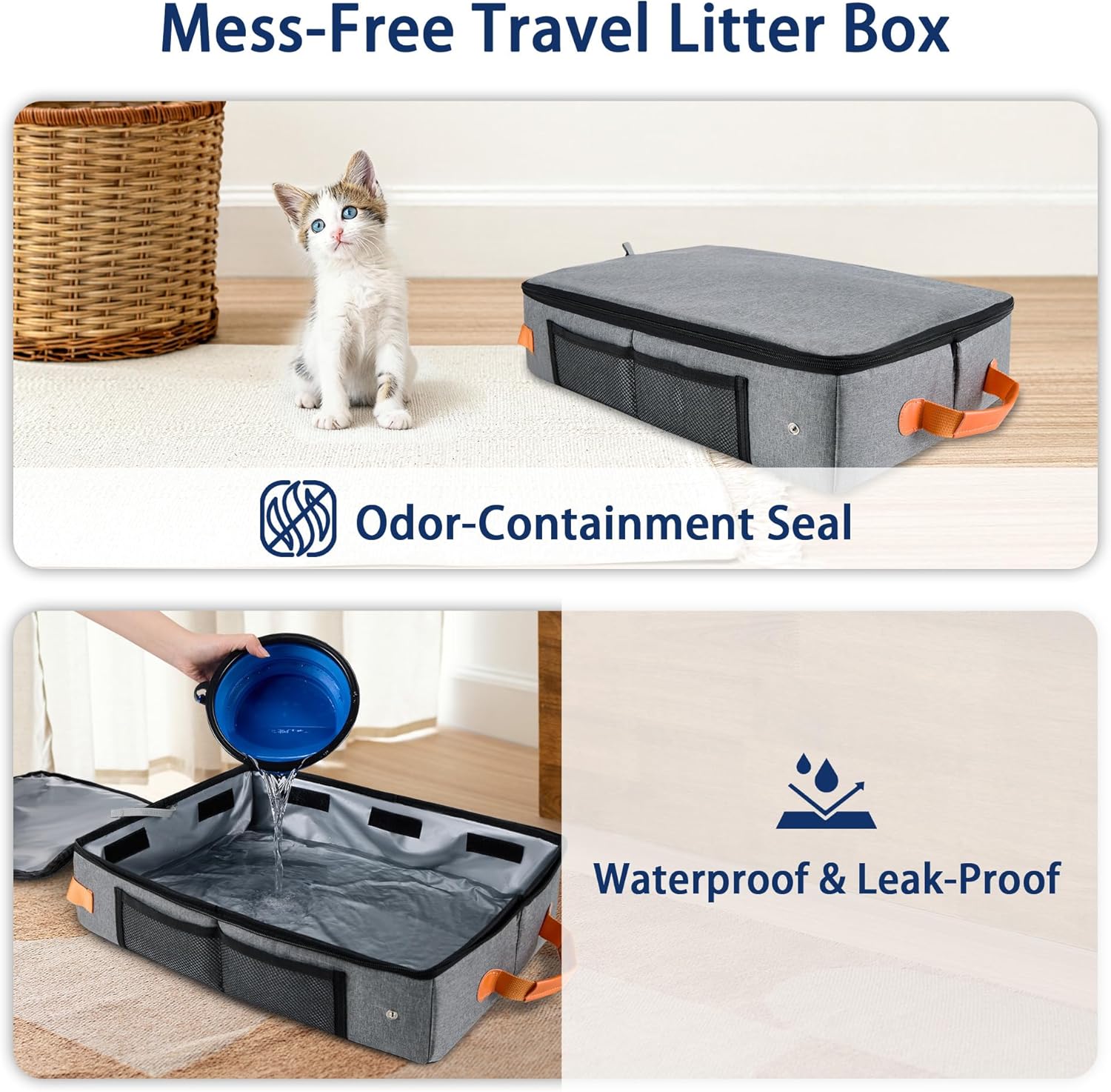 About this item 【Portable & Travel-Friendly】Foldable and lightweight, this portable cat litter box is perfect for travel, cars, hotel stays, camping, or flights. Gives your cat a familiar, private space anywhere for stress-free cat travel 【Spacious & Comfortable】Measuring 17.7" × 13.5" × 11", this cat litter box provides plenty of room for adult cats to turn, dig, and use comfortably. Works as a main, backup, or multi-cat travel litter box 【Waterproof & Easy to Clean】The fully waterproof interior keeps cat litter contained and prevents leaks. Smooth lining ensures a low-mess solution, ideal for car litter boxes, travel litter boxes, or small spaces 【 Collapsible with Lid & Splash Guard】Folds flat in seconds for easy packing. Removable splash guard and zipped lid help contain litter, reduce mess, and provide privacy for your cat during travel 【 Includes Scoop & Multi-Purpose Use】Comes with a scoop for quick cleaning. Can also serve as a storage bin or organizer for cat travel essentials, making it perfect for road trips, flights, or everyday cat travel › See more product details