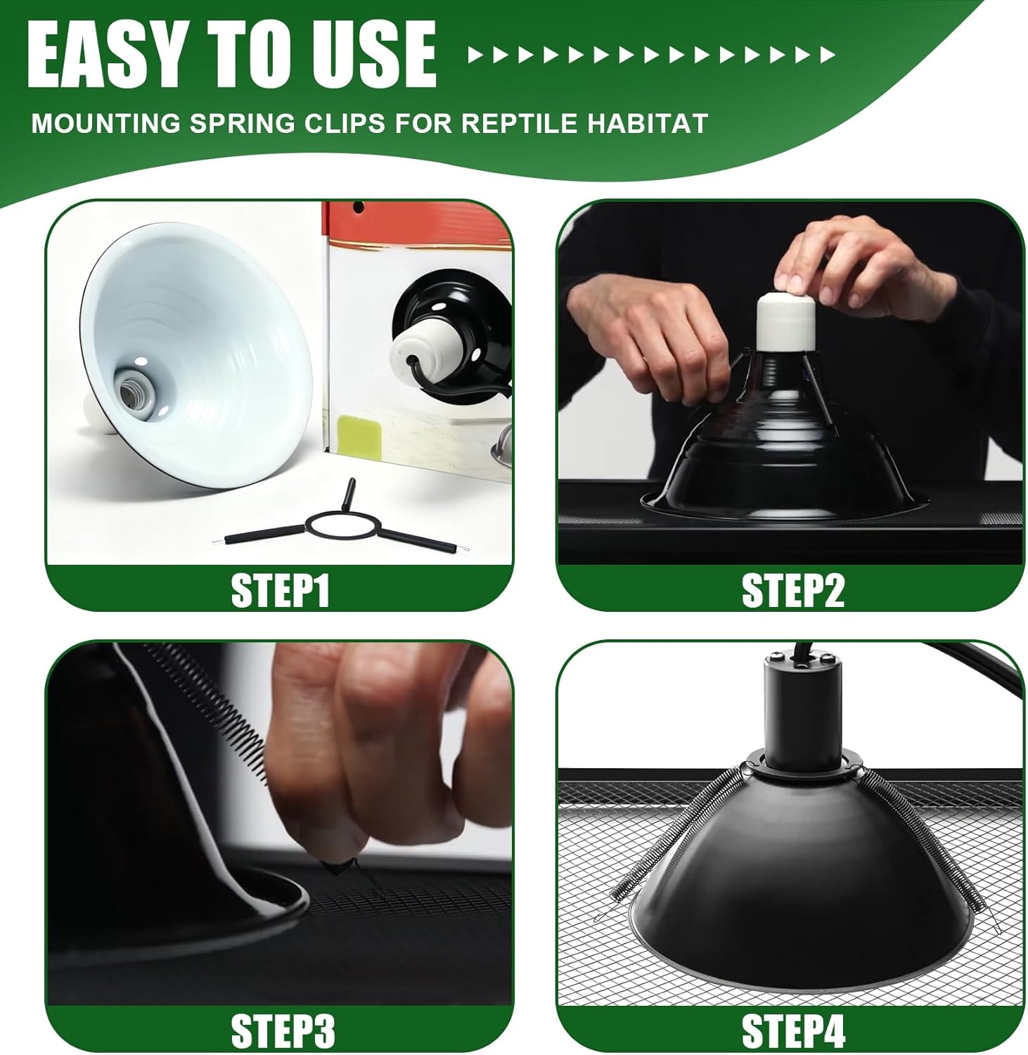 About this item Product Introduction:Mounting Spring Clips for most Reptile Habitat Lighting Domes,Universal Terrarium Lid Clamps, Secure Heat Lamp Dome Lock,you can use Mounting Spring Clips to SECURE LIGHTING DOME INTO PLACE with confidence Scope of Application:The lamp mounting spring fit for most reptile lighting domes, terrarium mesh screens, and heat lamp covers.Suitable for most lighting domes and screens(Note: Please check the specific dimensions before purchasing) High quality:Mounting Spring Clips made of high-quality materials, sturdy, durable, and not easily damaged, Rust-resistant stainless steel springs maintain shape under weight.Secure spring clamps prevent domes from falling, breaking bulbs, or damaging terrariums. Easy to use:No tools required. Manually press to open the clamp, position it securely, then release to lock in place. Easily adjust lamp angle and position anytime.Easy to install on your reptile's habitat and discreet.sturdy and reliable mounting without getting in the way. After-sales service and packaging:If you have any questions about our spring clips, you can consult us and we are happy to help you. The packaging includes 3 Pack Of Zilla Mounting Spring Clips for Reptile Habitat.( Three Metal Retaining Ring and nine Springs) › See more product details