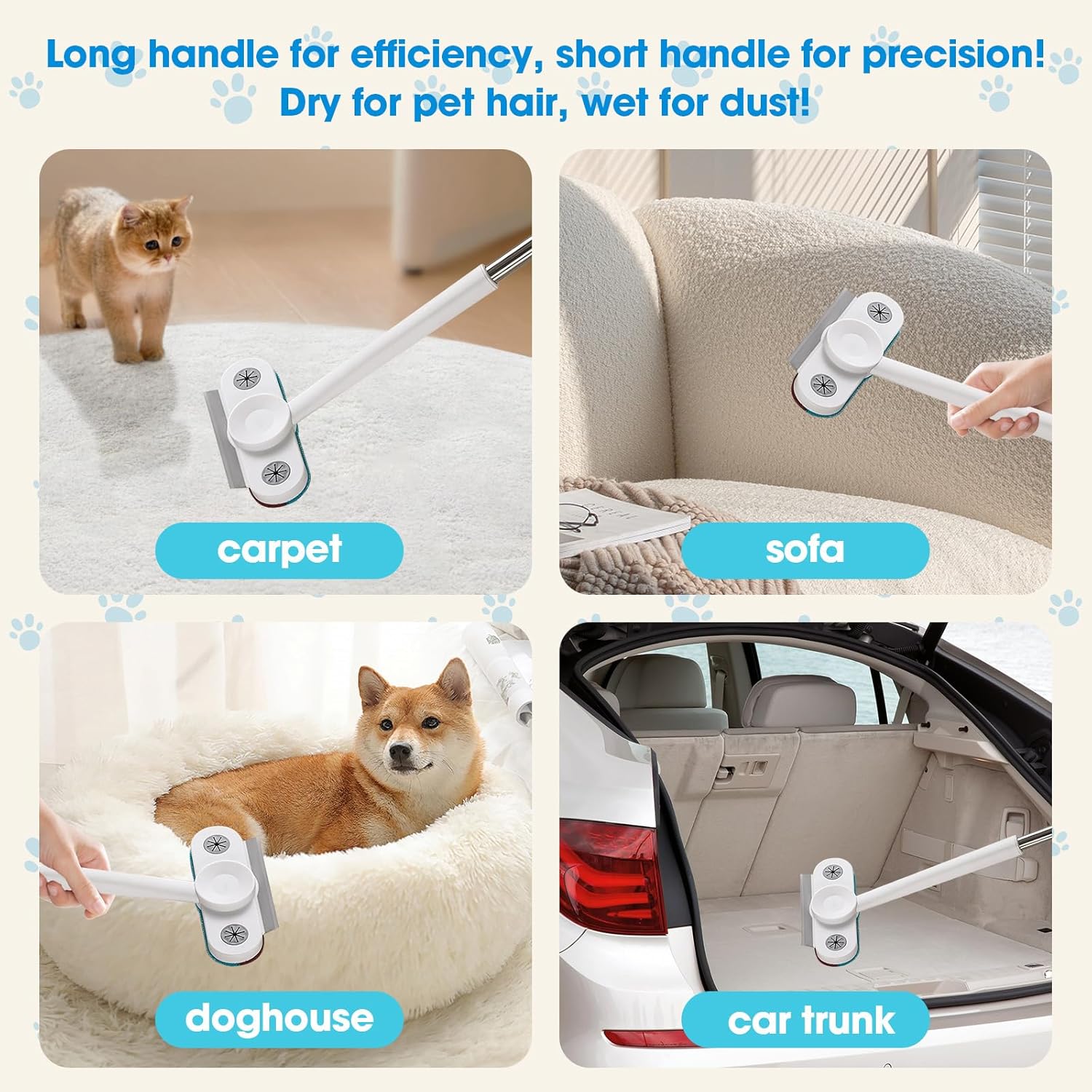 About this item 1、Dual-Directional Design:Repeat Push & Pull to Gather Hair Neatly: Equipped with reverse-direction polyester bristles—repeat pushing and pulling motions to guide pet hair toward the center, where it forms a tidy, noodle-like clump. No messy scattering or missed hairs; once the clump forms, just pinch it gently to discard. Simple "push-pull-collect" steps make pet hair cleanup fast and hassle-free. 2、Ergonomic Design: Protects Waist & Knees, Saves Effort.Features an extra-long handle that eliminates bending, effectively reducing strain on your waist and knees when cleaning low areas like carpets or high spots such as air vents. The 25° golden angled brush head fits snugly against all surfaces, ensuring optimal force with each swipe, making cleaning effortless even for long periods. 3、Multi-Scenario Use: One Tool for All Areas With detachable short handle design, it’s versatile for every cleaning need: long handle for walls, air vents, and large carpets; short handle for mirrors, sofas, and pillows. No more switching between multiple tools—one pet hair remover covers your entire home, simplifying your cleaning routine. 4、Durable Quality for Long-Term Reuse: Crafted from premium, wear-resistant materials, this tool is built to withstand frequent use without deformation. When dirty, just rinse with water (no soap required) and it’s ready to use again—reusable design saves money while maintaining strong cleaning performance over time. 5、Premium Durability & Family-Pet Friendly:Crafted from high-quality materials, this pet hair removal tool is built to withstand long-term use, ensuring reliable performance. It efficiently removes pet hair while being gentle on furniture, carpets, and other household surfaces. Spend just 5 minutes a day with this single tool to tackle pet hair chores, creating a clean, safe, and cozy environment for your family and pets. Note: Not recommended for use on clothing. › See more product details