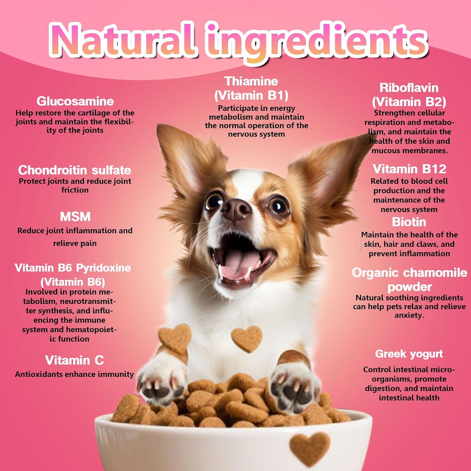- Active Ingredients: Glucosamine sulfate,Chondroitin sulfate,MSM,Organic chamomile powder,Vitamin C,Yuca Schidigera Extract,Organics Passion Flower,Valerian Root,Enzyme Blend (Amylase, Protease, Lipase, Cellulase, Lactase, Bromelain),Greek yogurt (non-fat dry milk, lactic acid, Bacillus coagulans, Lactobacillus brevis, Lactobacillus plantarum, Streptococcus thermophilus),Thiamine(Vitamin B1),Riboflavin(Vitamin B2),Vitamin B12,Biotin,Vitamin B6 Pyridoxine(Vitamin B6),Organic TurmericSee more