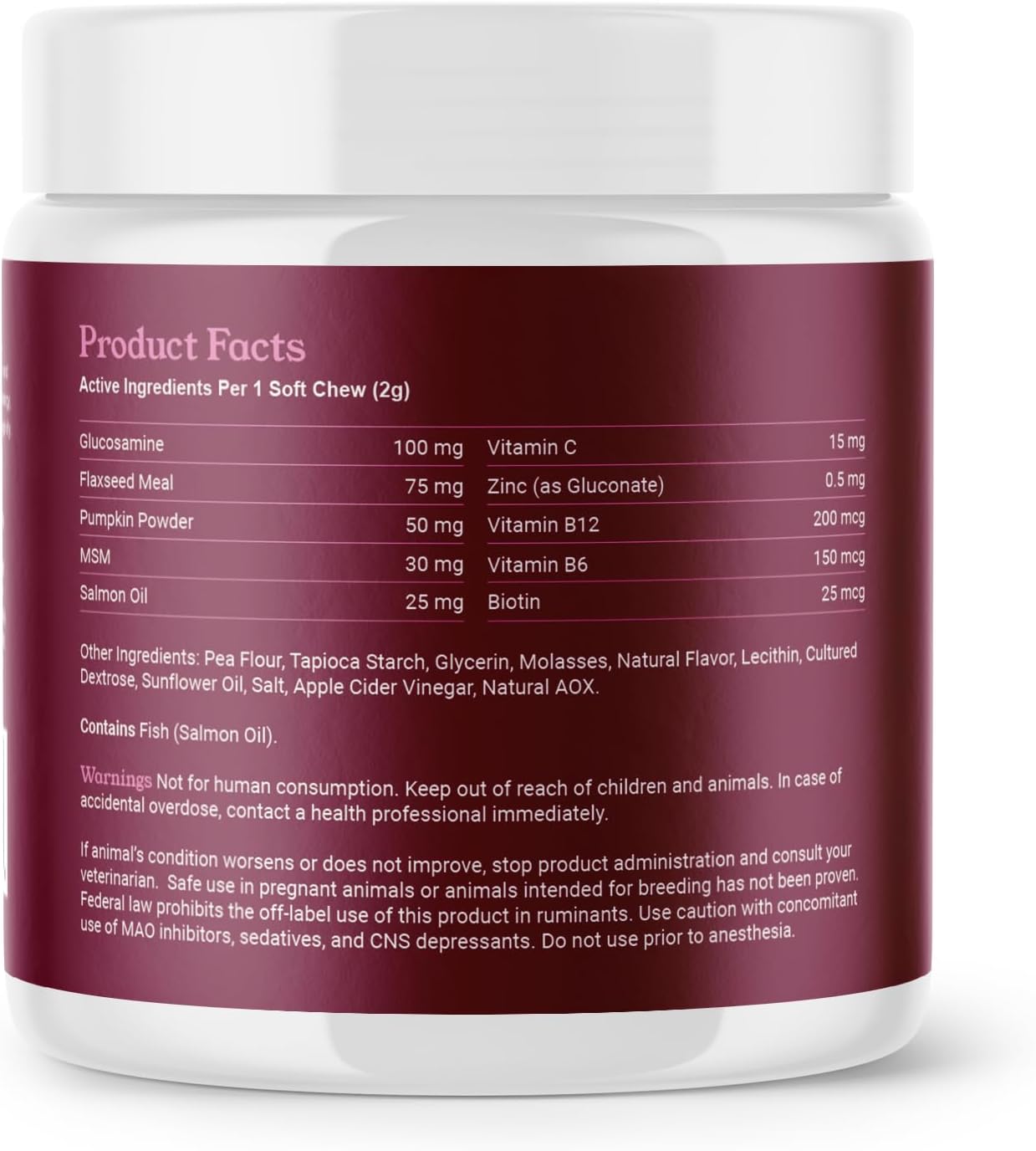 About this item Features ingredients like Vitamin C and Zinc, which are known to help maintain a healthy immune system. Packed with Fennel Seed Meal, Turmeric, and Apple Cider Vinegar, these chews provide powerful support for your dog’s immune system while helping to alleviate seasonal allergies naturally. Includes B vitamins and Biotin, commonly used to support energy levels and vitality. Formulated with Glucosamine, Salmon Oil, and Pumpkin Powder to help maintain skin, coat, digestive health, and joint function. › See more product details