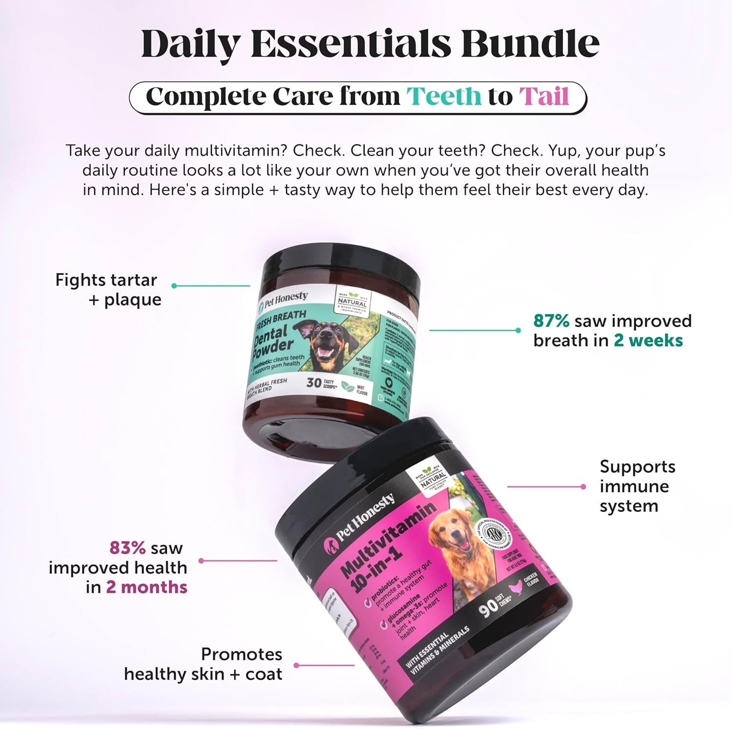 About this item 10 Benefits in 1 Daily Chew - Our 10 in1 Multivitamin chews combine a well-rounded blend of essential vitamins and supplements for dogs' overall daily health including glucosamine, probiotics, vitamins, and omegas. Vitamins A, C, and D3 have antioxidant properties that help improve your dog's immune system and keep their heart strong and healthy. Joint Health with Glucosamine - These soft chews have high amounts of glucosamine and other joint support ingredients that may help reduce joint inflammation caused by normal activity. These chews may help increase mobility and flexibility in your dog by providing building blocks for synovial fluid, cartilage, and connective tissues. Help Improve Digestion and Skin - Our chews contain 1 Billion CFU probiotics and pumpkin, which help keep your dog's digestive system and digestive tract running smoothly as well as targeting root causes of skin irritation. Their coat health is also supported by eggshell meal and omegas from krill oil, which can help heal dry, itchy, and flaky skin and increases coat strength, shine, and overall health. Pet Honesty Pledge: A taste your pet will love & results you can trust. Made with the most effective natural + other premium ingredients. Formulated without corn, wheat, or soy. No artificial preservatives, colors, or flavors. Made in the U.S.A. | NASC Member Company: All Pet Honesty products are made in the US with US and globally sourced ingredients and are produced in a GMP compliant facility that meets the highest safety standards so you can rest assured you're giving your pet the best quality product possible! Pet Honesty is also a NASC member company meaning it’s met the highest quality and compliance standards for pet supplements. › See more product details