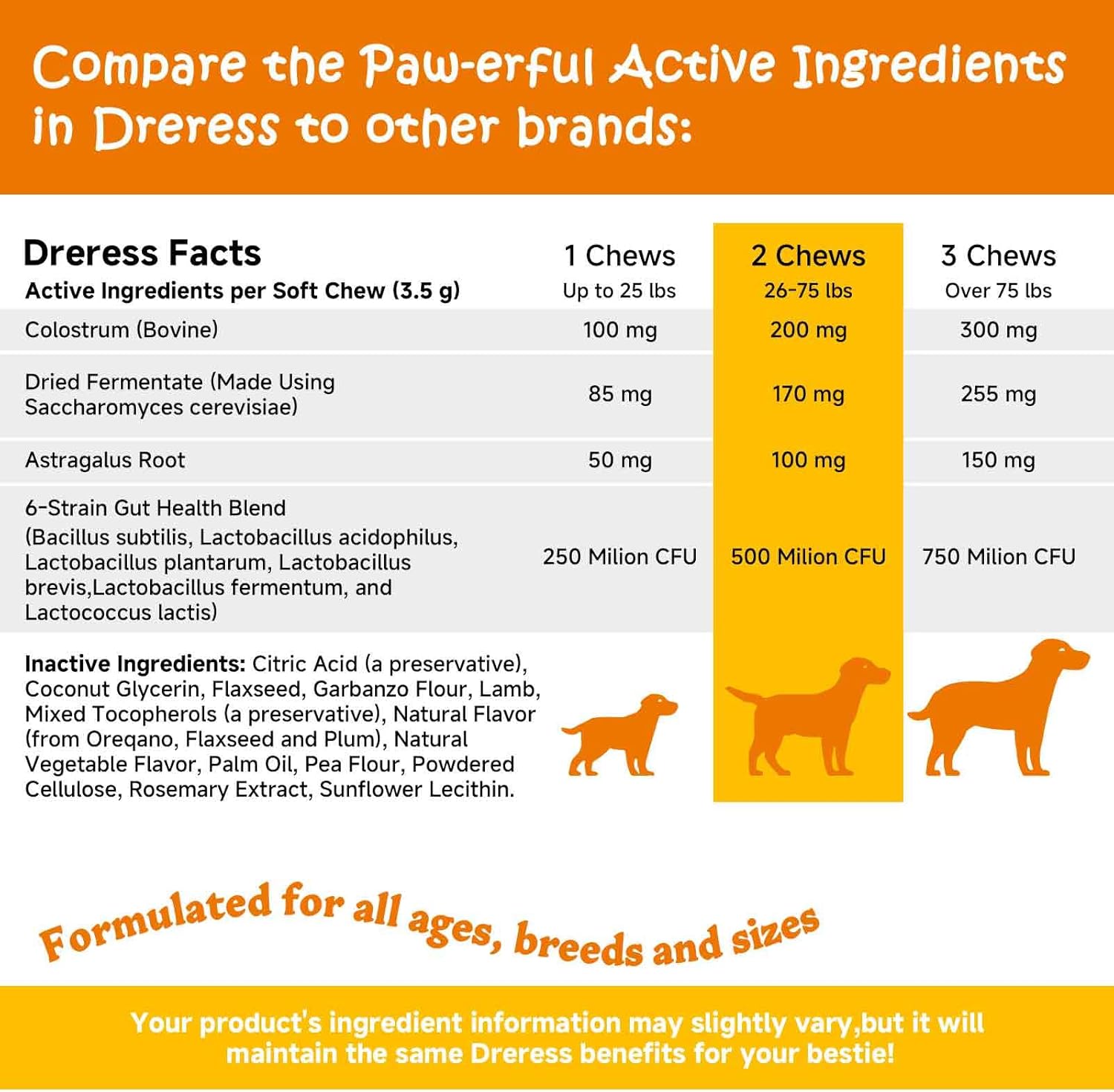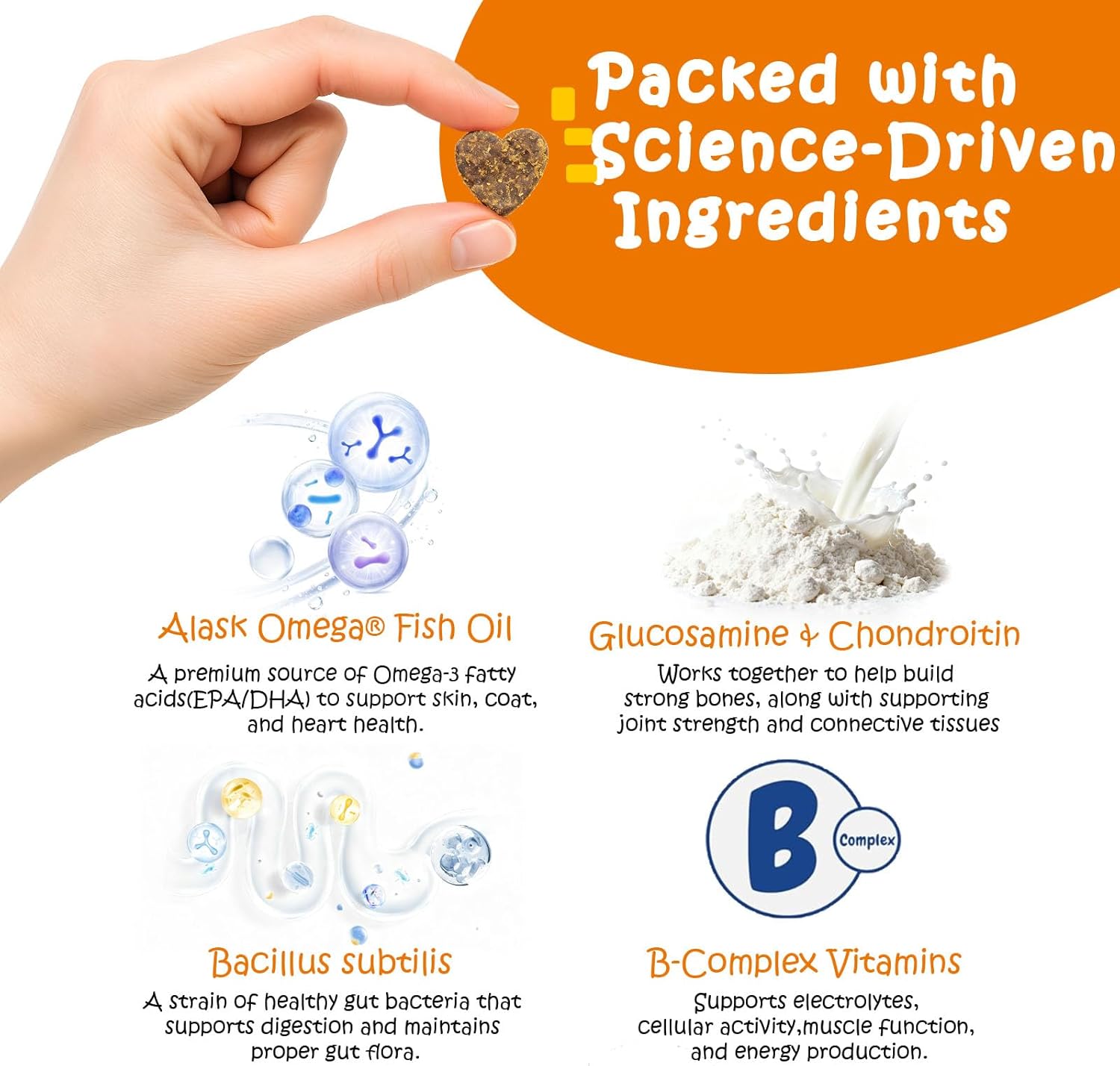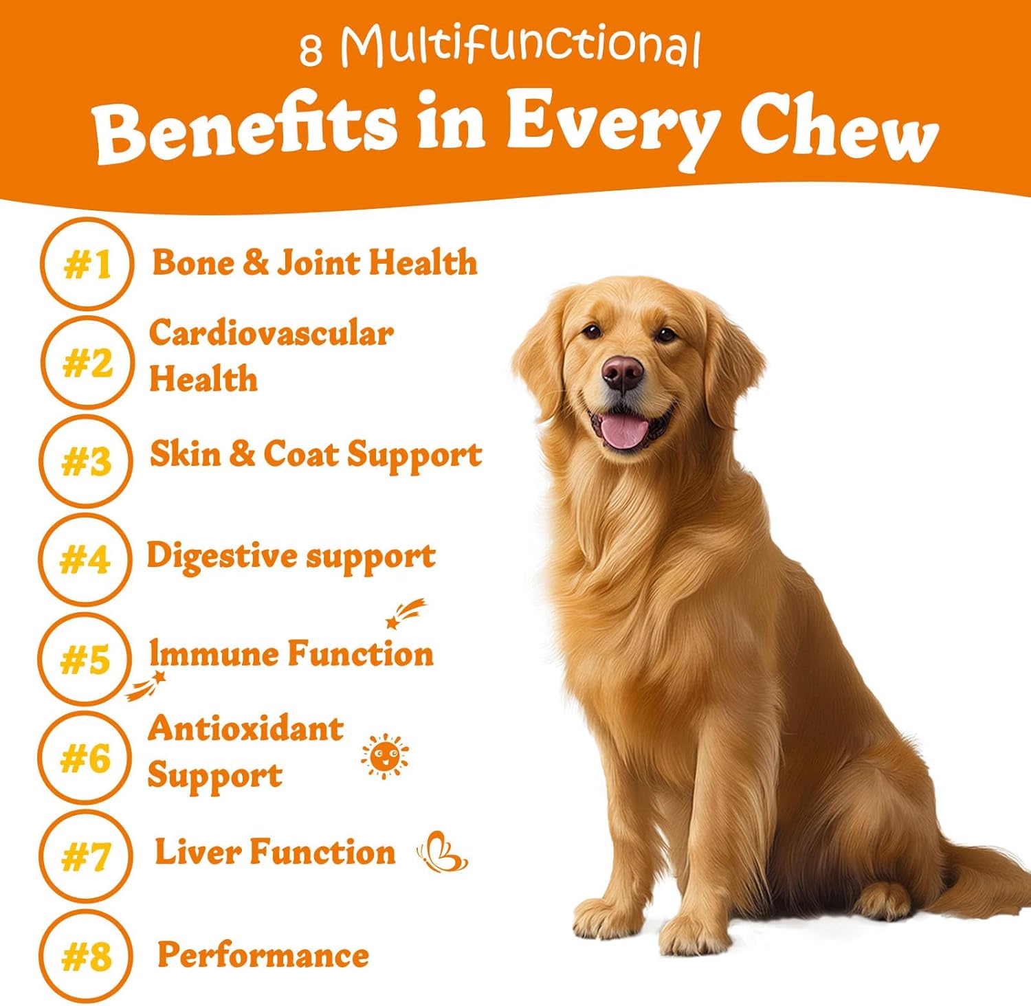 About this item JOINT SUPPORT: This multivitamin for dogs contains Glucosamine Chondroitin, with OptiMSM and Cod Liver Oil, offering enhanced joint and hip performance IMMUNE ENHANCEMENT: Features Cod Liver Oil and Vitamins A, C, & E to bolster your dog's immune system. This multivitamin for dogs strengthens defense against health challenges DIGESTIVE HEALTH: Includes a six-strain Gut Health Blend with 500 million CFU per chew. These probiotics for dogs support healthy gut flora, normal bowel function, and overall digestive wellbeing SKIN AND COAT MAINTENANCE: Formulated with Cod Liver Oil and Vitamin E, along with CoQ10, these dog vitamins for itchy skin maintain skin moisture and reduce oxidative stress CARDIOVASCULAR AND LIVER SUPPORT: Enriched with CoQ10, Cod Liver Oil, and powerful antioxidants, these dog supplements & vitamins support heart and liver health, helping your dog stay active and healthy βΊ See more product details
